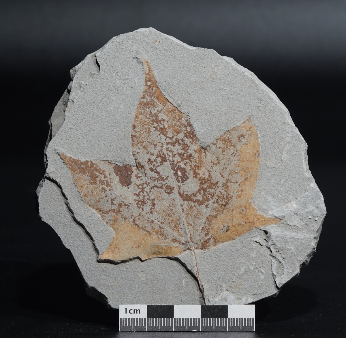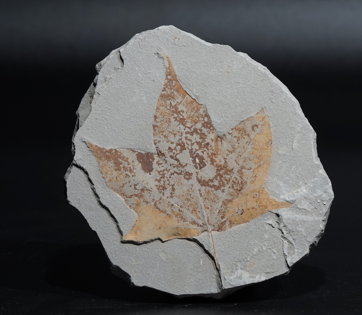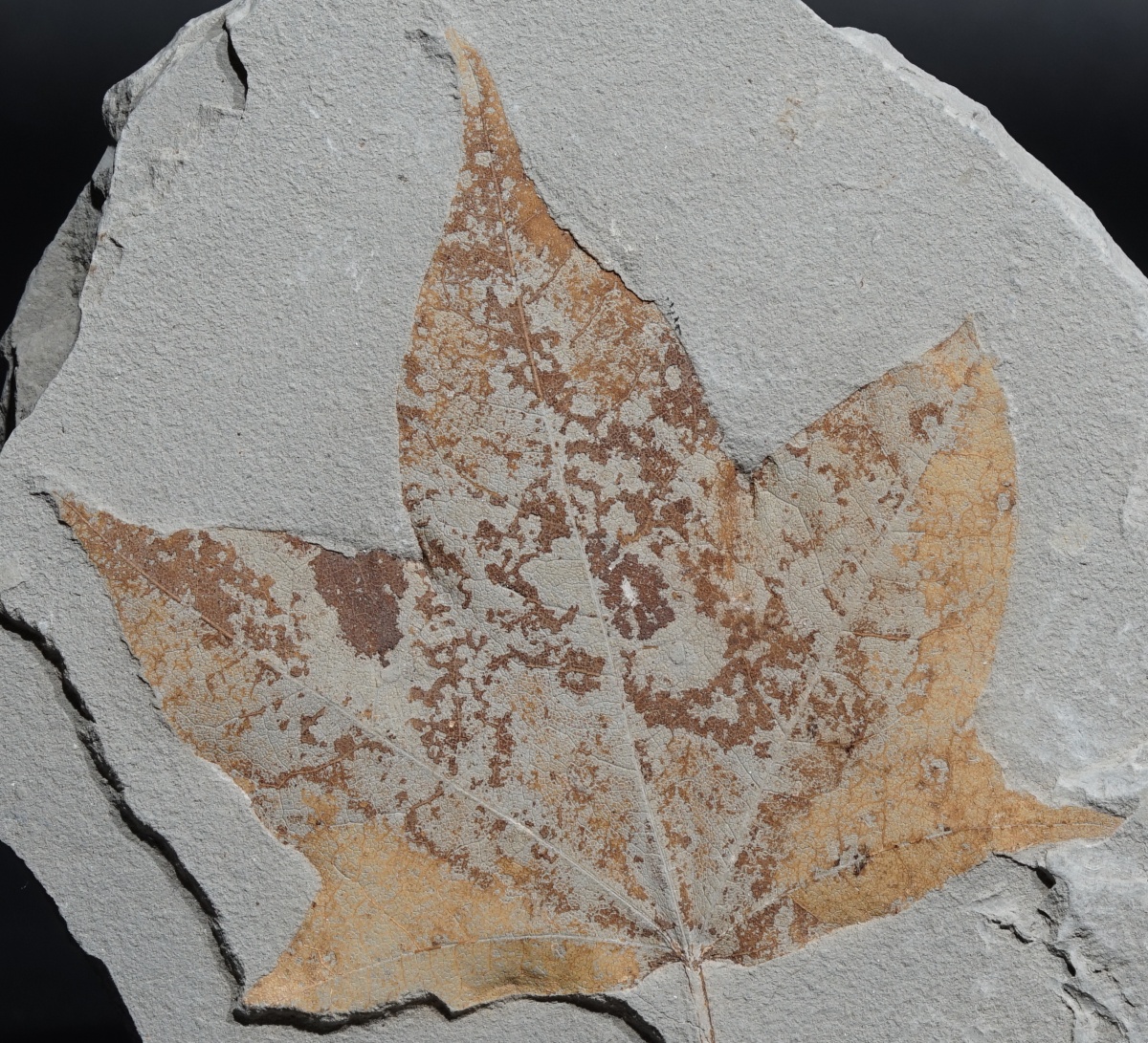 Ein hervorragend erhaltenes Ahornblatt aus dem oberen Pliozän von Willershausen. Die Fundstelle steht heute unter Schutz, Stücke wie dieses sind heute nur noch selten aus alten Sammlungen zu bekommen.