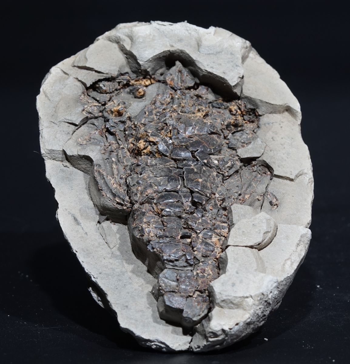 Ein außergewöhnlicher Fund aus dem Pliozän von Willershausen. Dieser Flusskrebs blieb in einer Konkretion annähernd dreidimensional erhalten. Die Beine sind vorhanden und die Qualität der Schale ist hervorragend, der Körper ist lediglich etwas verdrückt und von Schrumpfungsrissen durchzogen, die bei der Diagenese entstanden. Die Fundstelle steht heute unter Schutz, Stücke wie dieses sind heute nur noch selten aus alten Sammlungen zu bekommen.