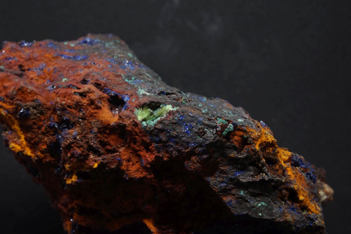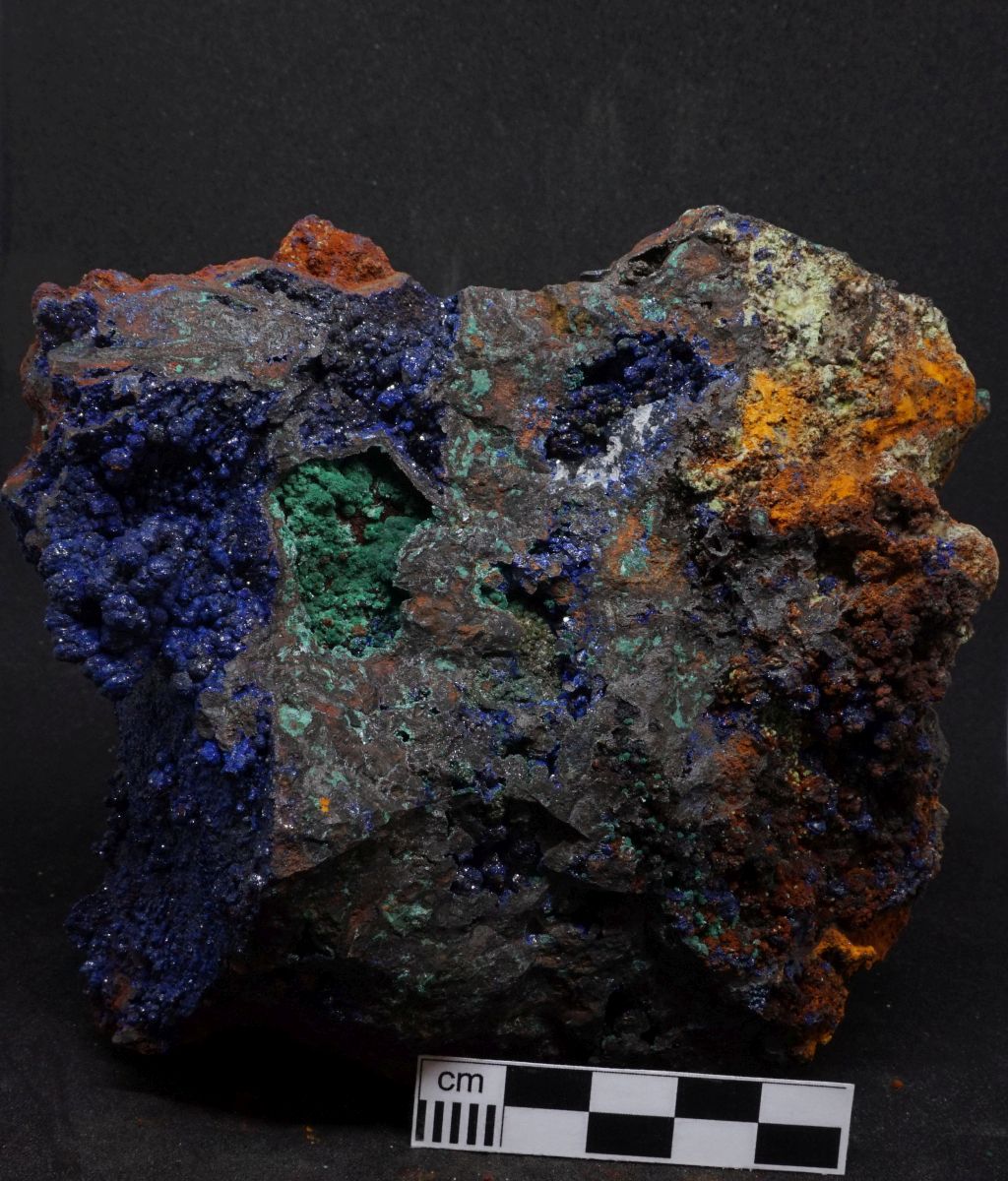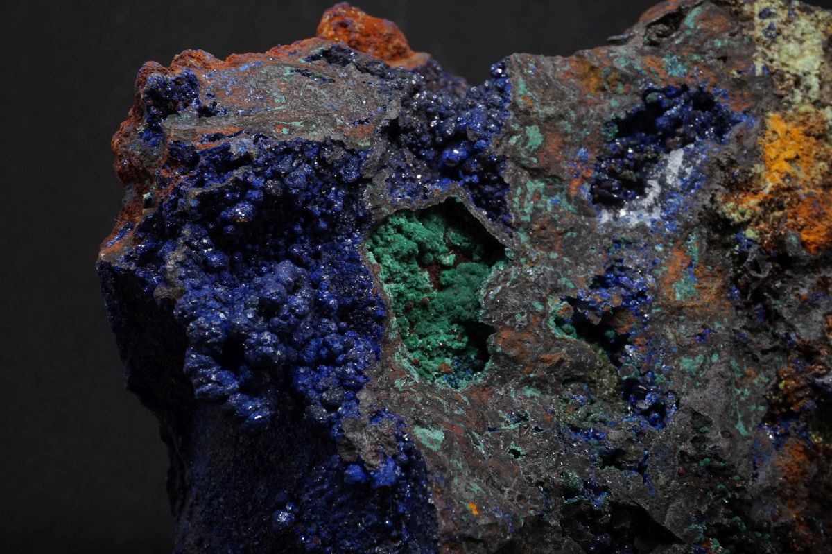 Eindrucksvolle Stufe mit drei verschiedenen Kupfermineralien aus Laurion in Griechenland.
