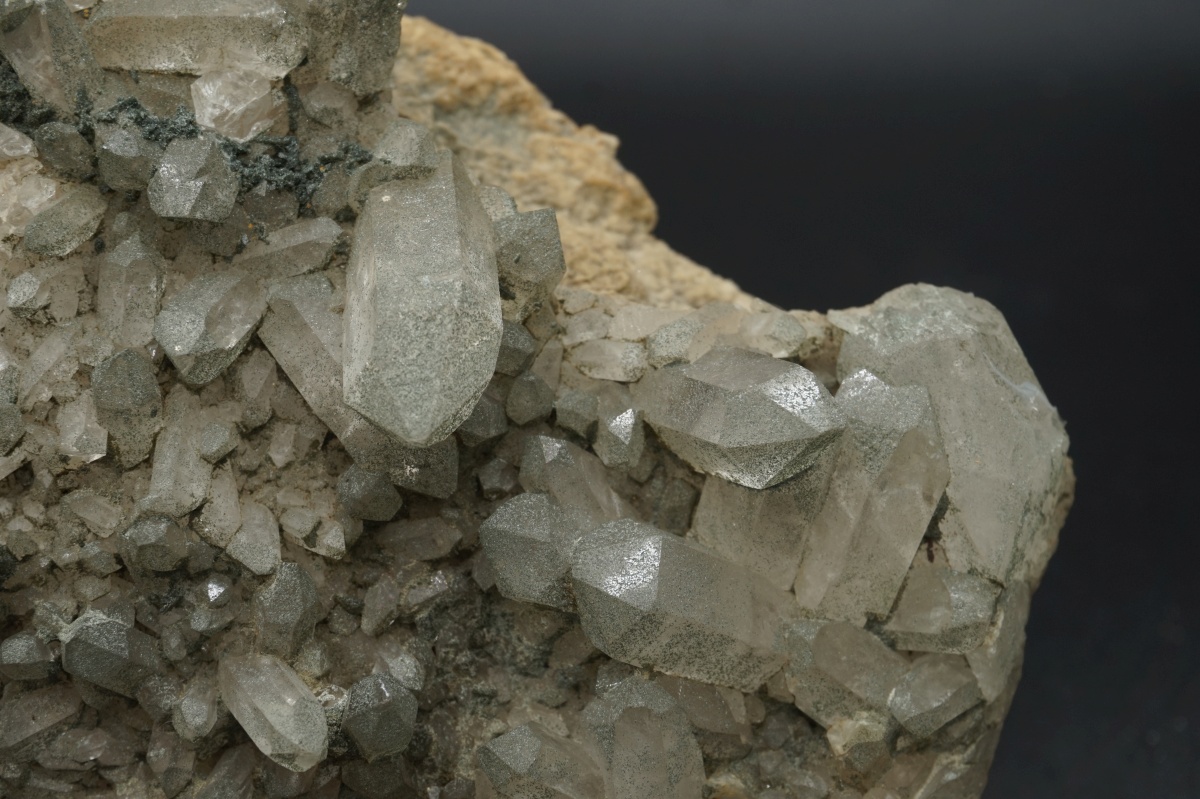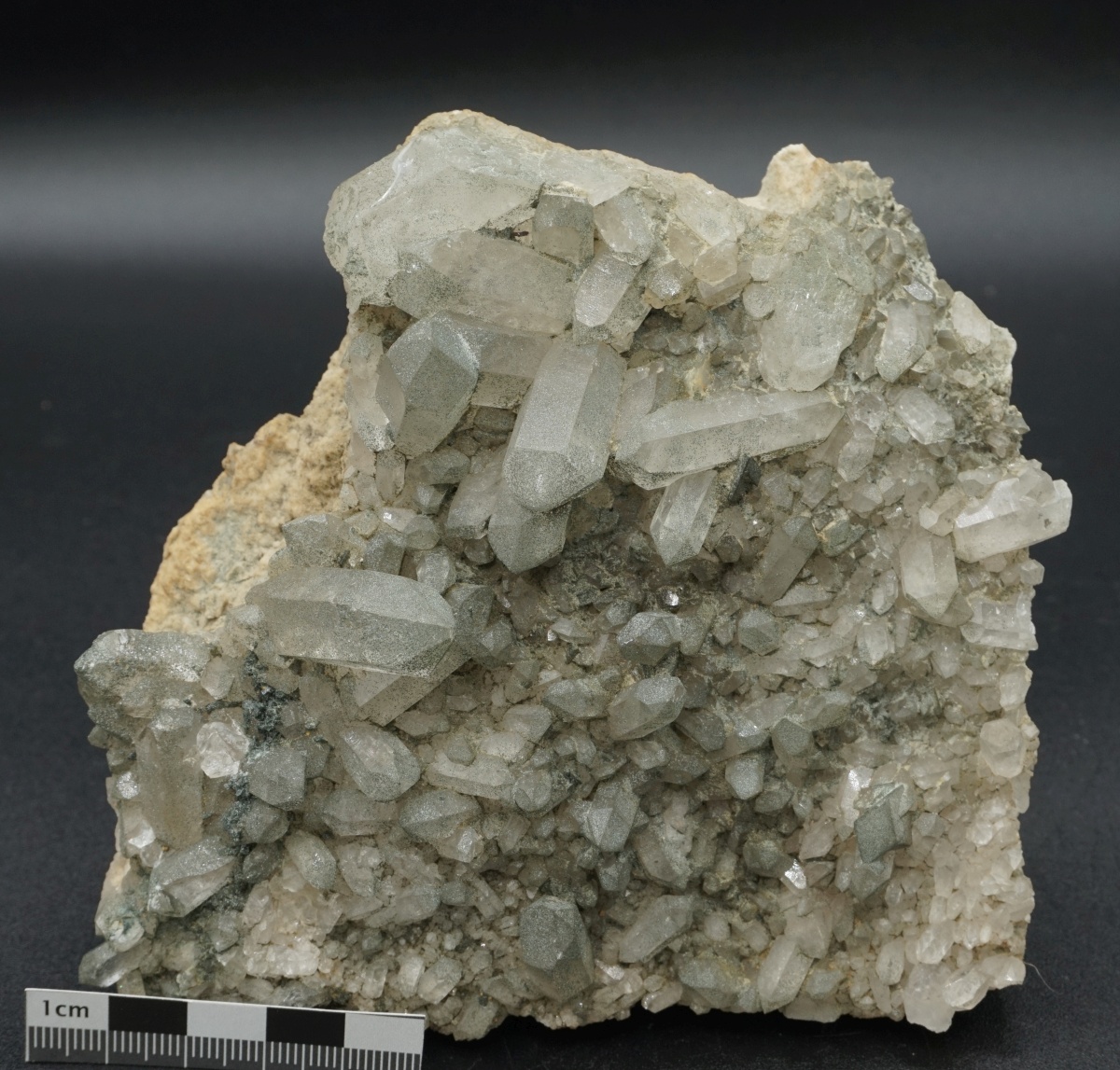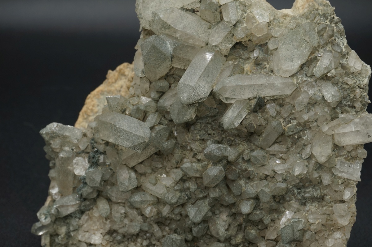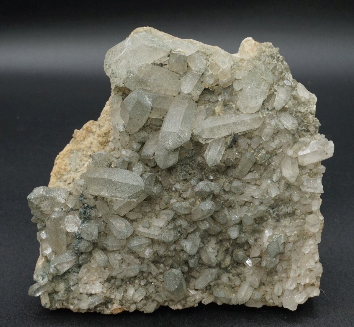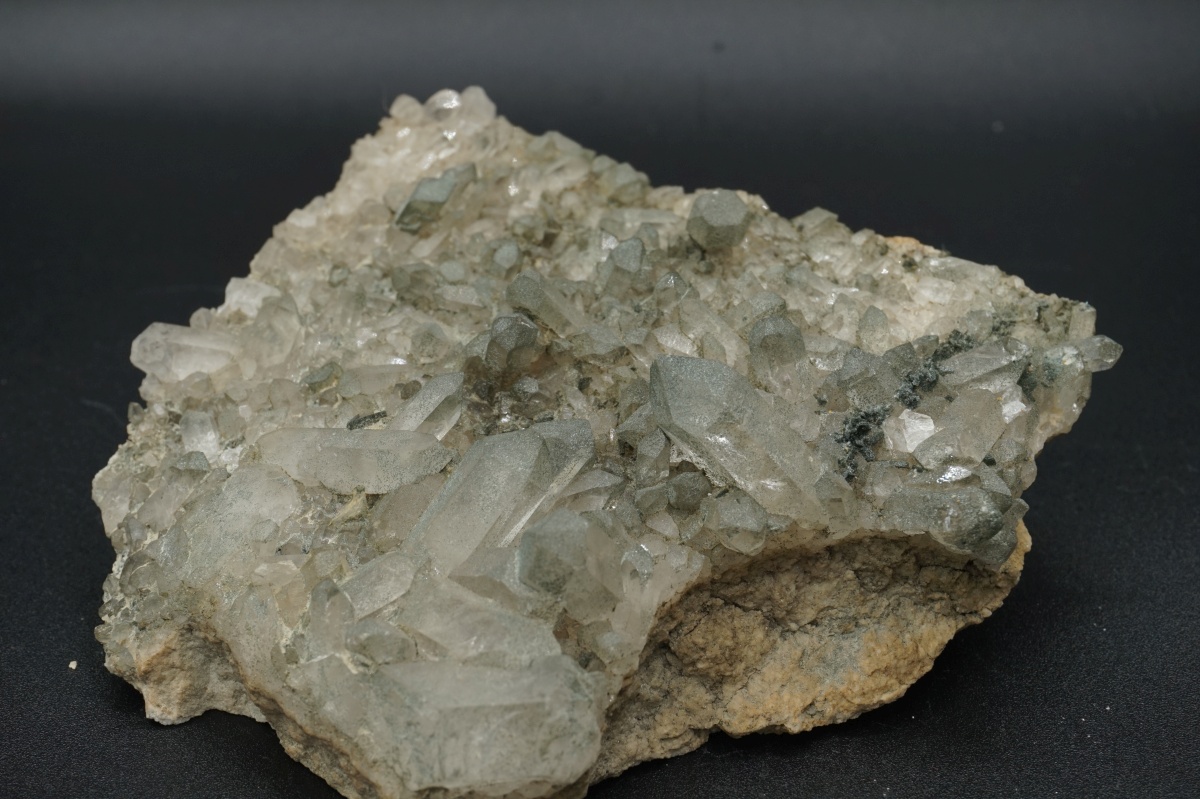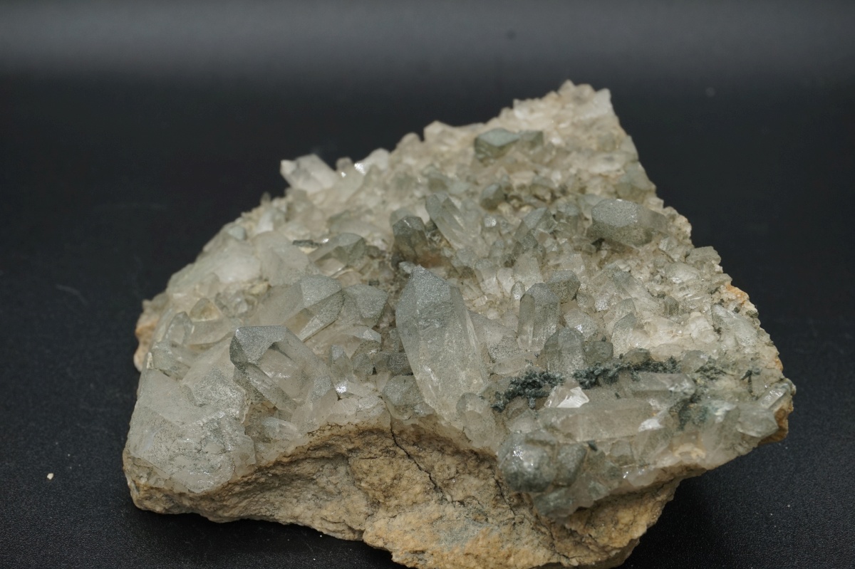 Eine attraktive Vitrinenstufe mit Bergkristallen, die teilweise mit Chlorit überwachsen sind. Eine klassische Paragenese aus einer alpinen Zerrkluft, die in keiner Sammlung fehlen darf.