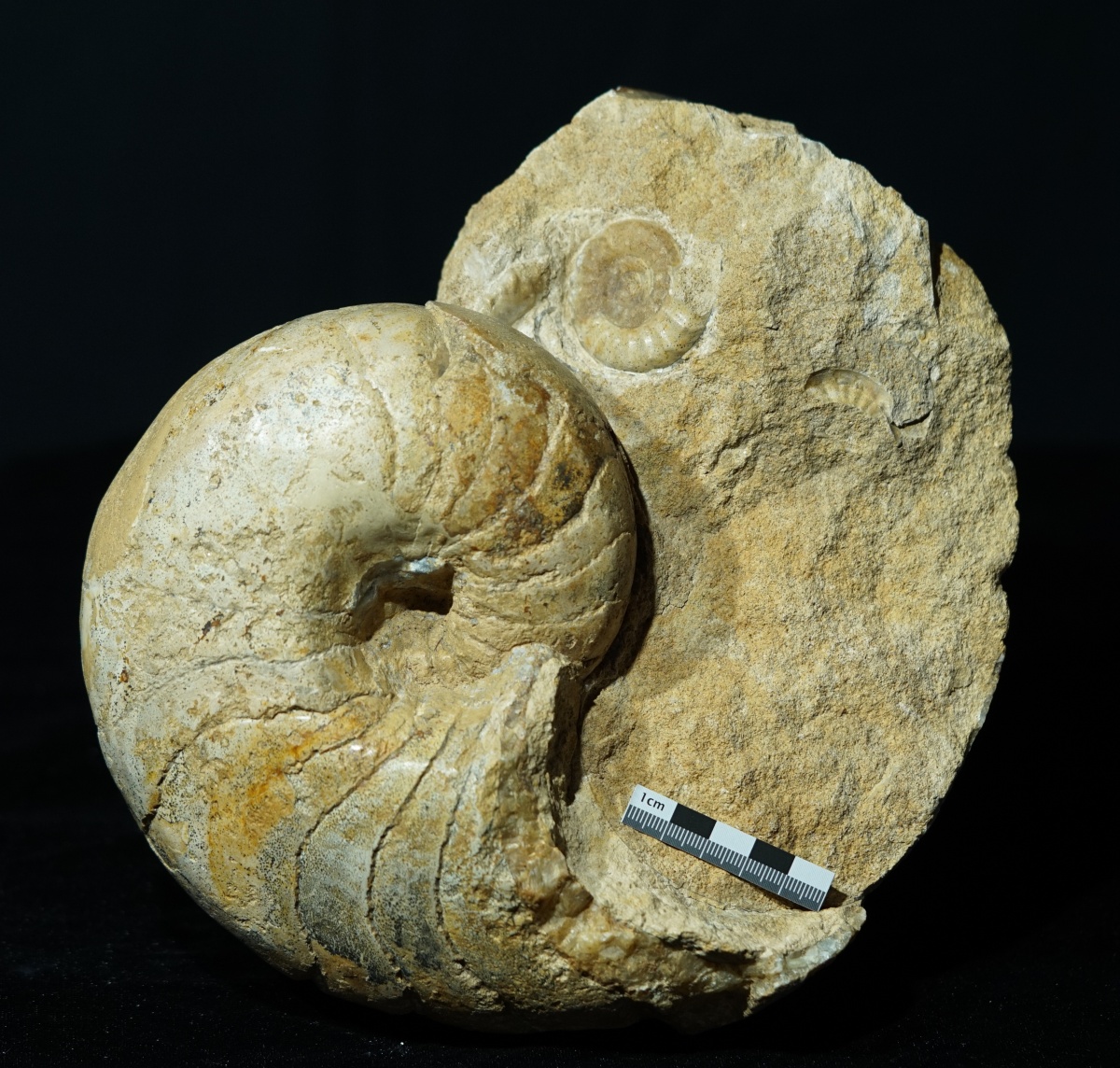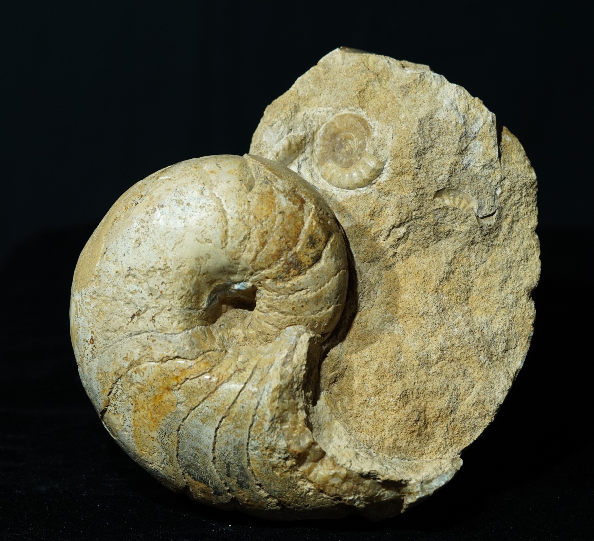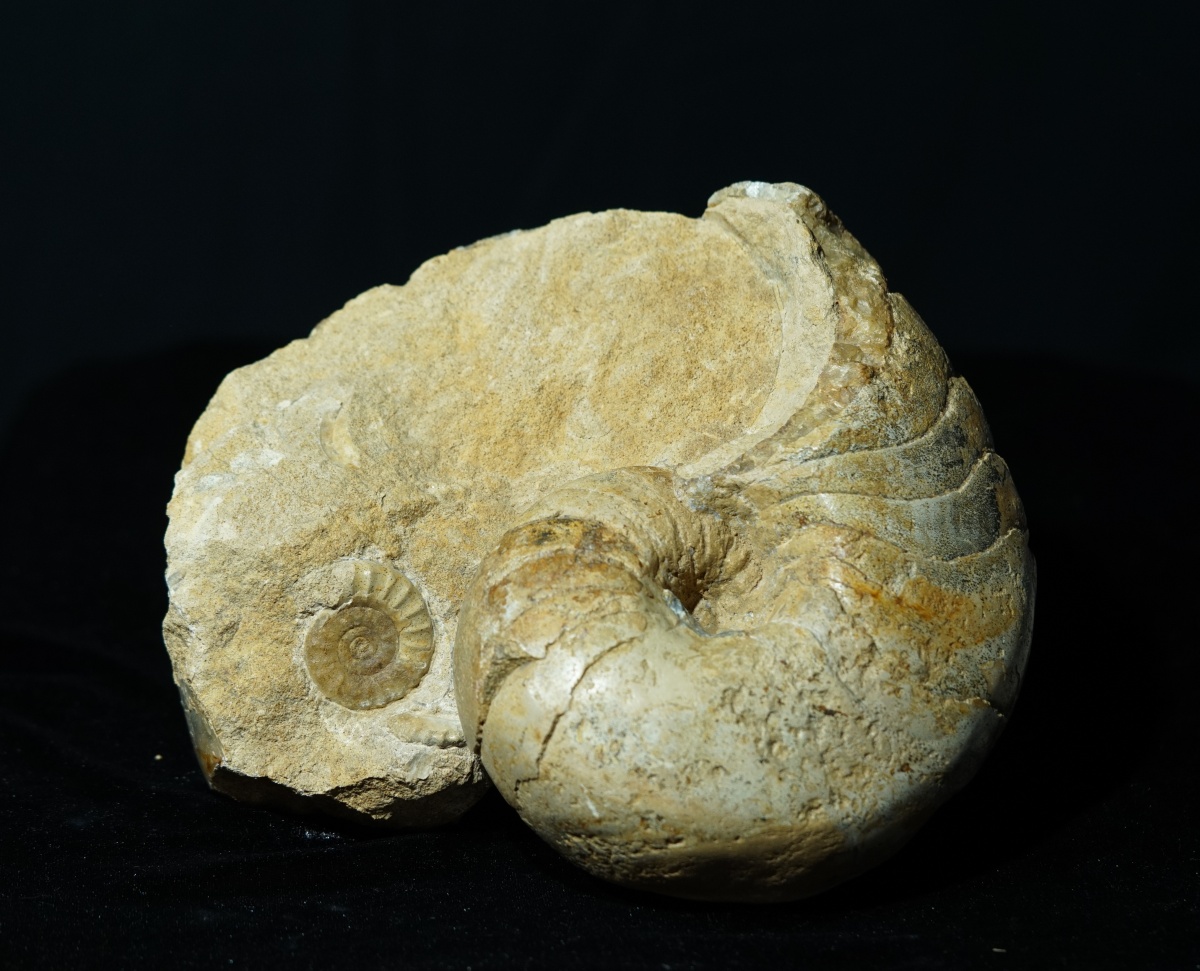 Eine wunderbare Doppelstufe aus einem großen Nautilus mit einem kleinen Ammoniten, der in die Wohnkammer eingespült wurde.