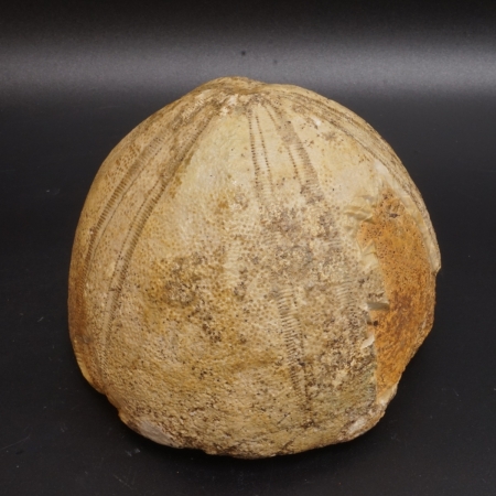 Ein musealer Riesenseeigel aus dem Eozän des ehemaligen Erzbergbaus am Kressenberg bei Traunstein. Trotz kleinerer Makel beeindruckt dieser seltene Seeigel allein schon durch seine Größe und ergänzt jede Seeigelsammlung um einen beeindruckenden Blickfang.