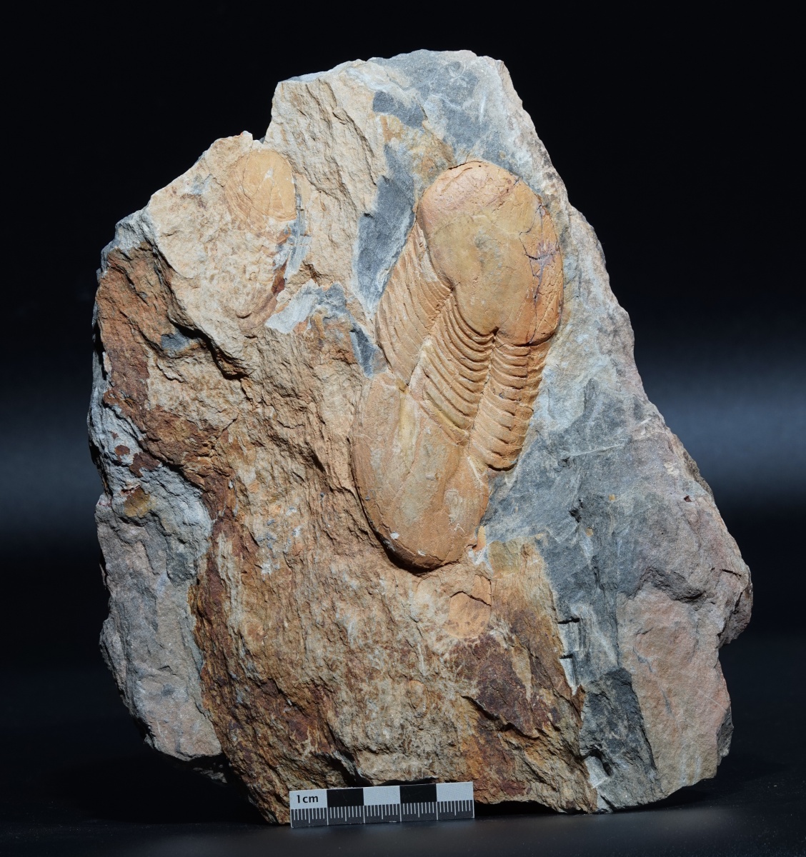 Ein großer Trilobit aus dem mittleren Ordovizium von Portugal. Die Stufe besticht durch ihren tollen Farbkontrast. Neben dem großen Trilobiten ist noch ein unvollständiges, zweites Exemplar erhalten. Durch tektonische Beanspruchtung des Gesteins wurde der Trilobit über die Jahrmillionen leicht verzerrt.