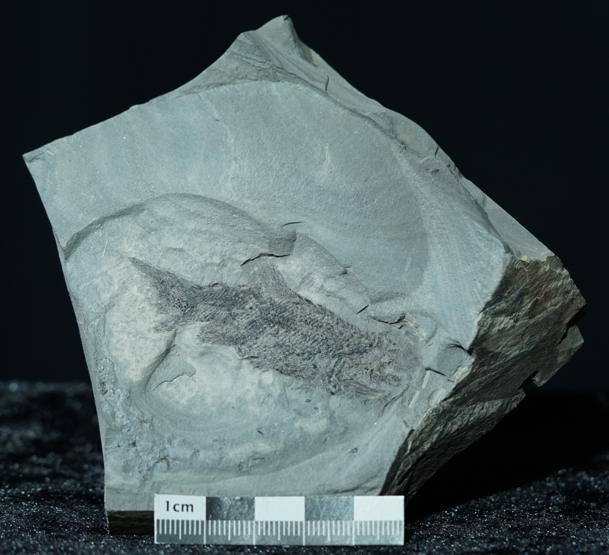Ein vollständiger, kleiner Fisch aus den Seesedimenten des Unterrotliegend von Jeckenbach. Das Stück stammt aus einer alten Sammlung.