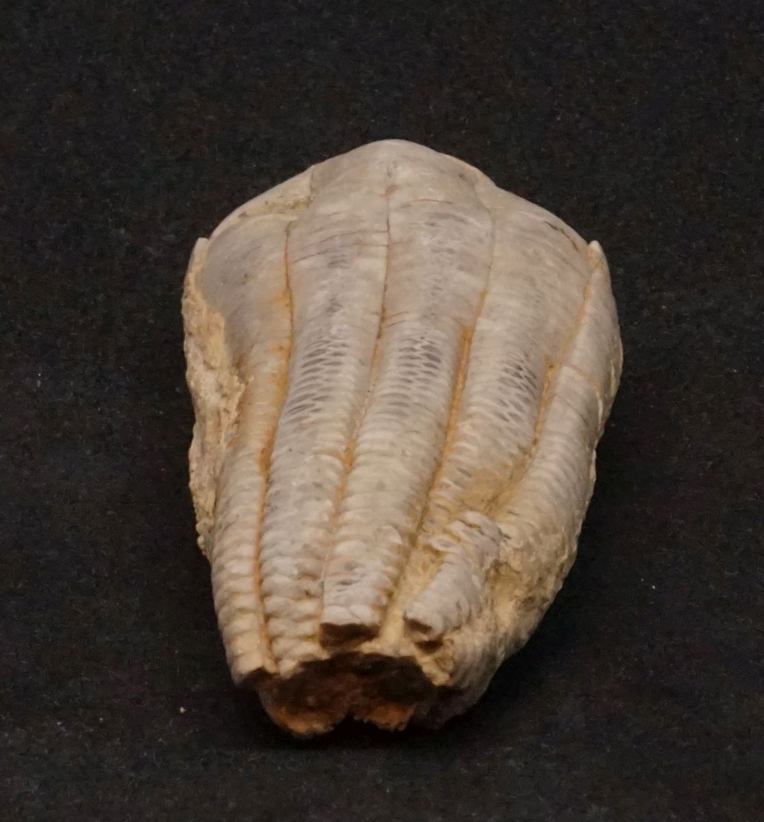 Eine fantastisch erhaltene Krone der klassischen Muschelkalk-Seelilie Encrinus liliiformis. Die Krone liegt komplett ohne Matrix vor und hat auf der Rückseite noch Potenzial für eine schonende Nachpräparation, um die letzten Sedimentreste zu entfernen. Einzelne Skelettelemente zeigen noch Farbmustererhaltung im typischen blass-violett.