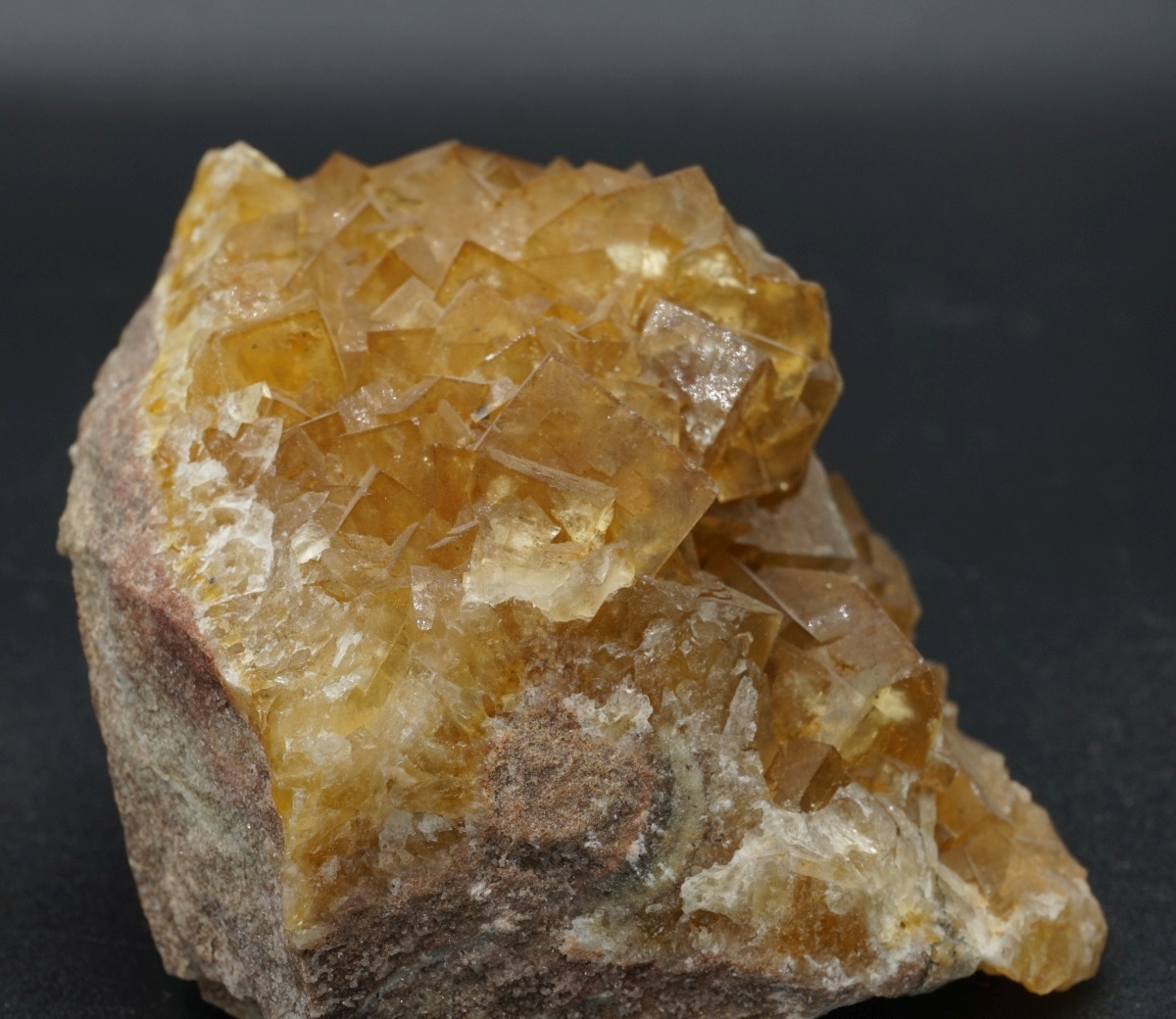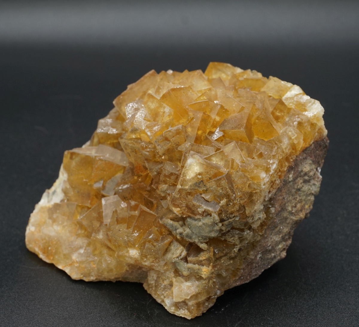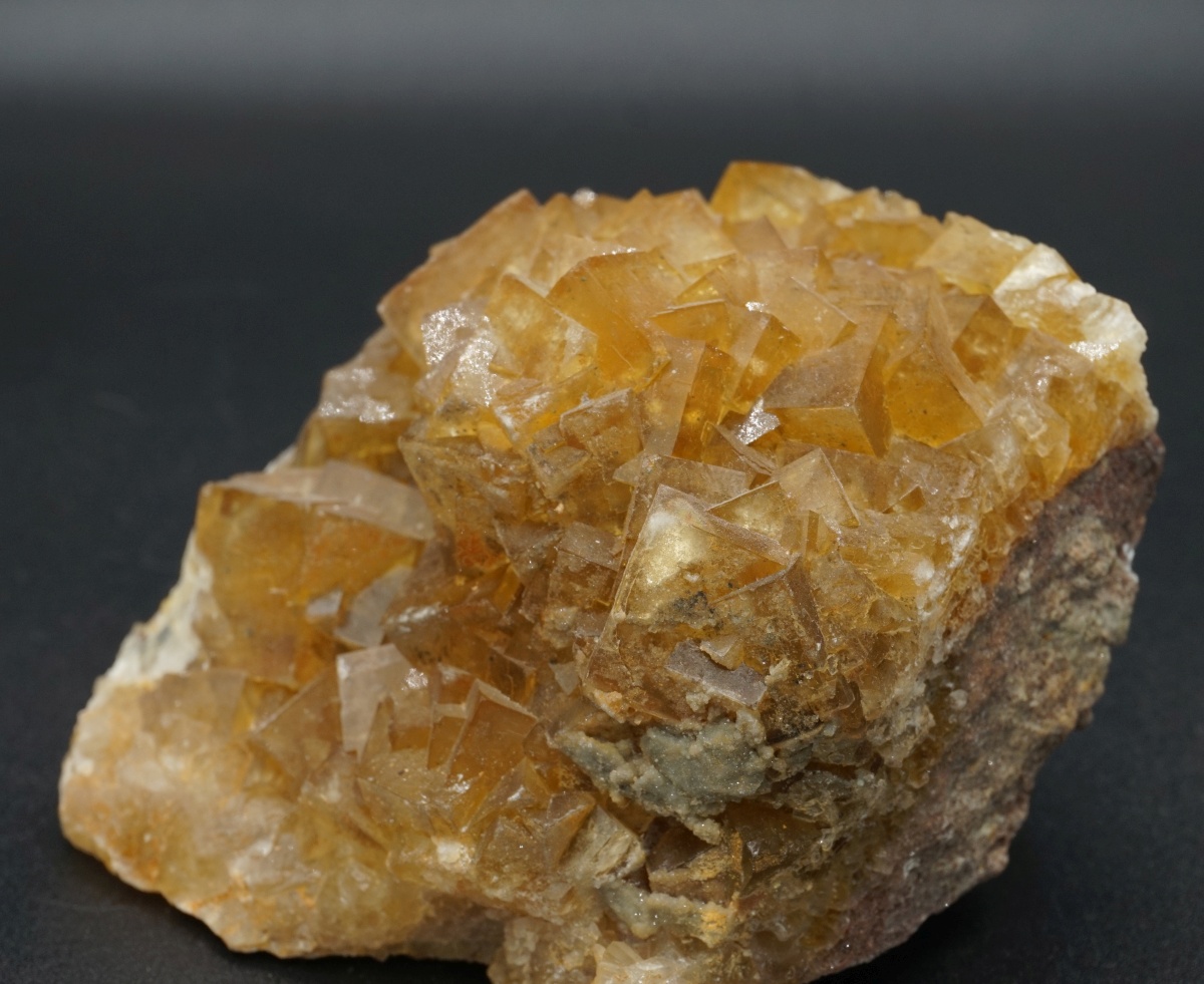 Eine super Stufe aus honiggelben Fluoritwürfeln auf Matrix aus dem Bergbaurevier Aouli bei Midelt in Marokko.