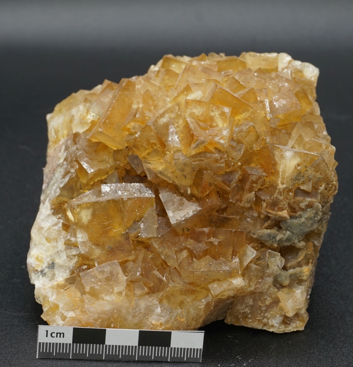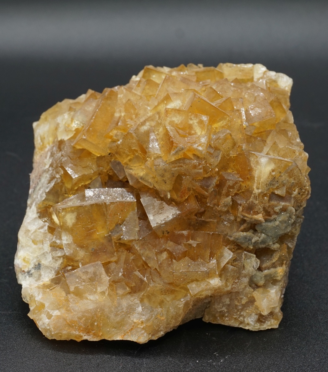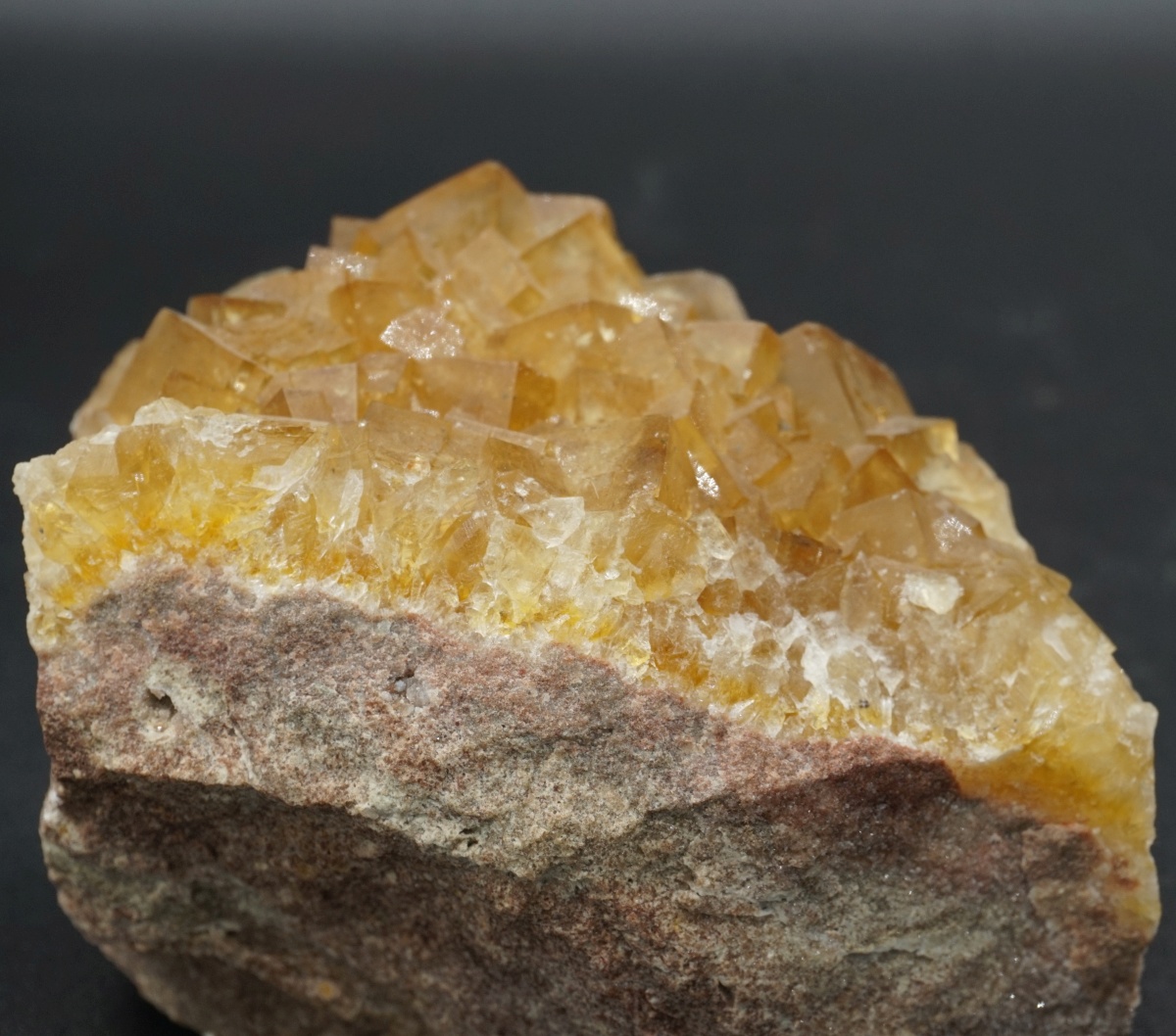 Eine super Stufe aus honiggelben Fluoritwürfeln auf Matrix aus dem Bergbaurevier Aouli bei Midelt in Marokko.