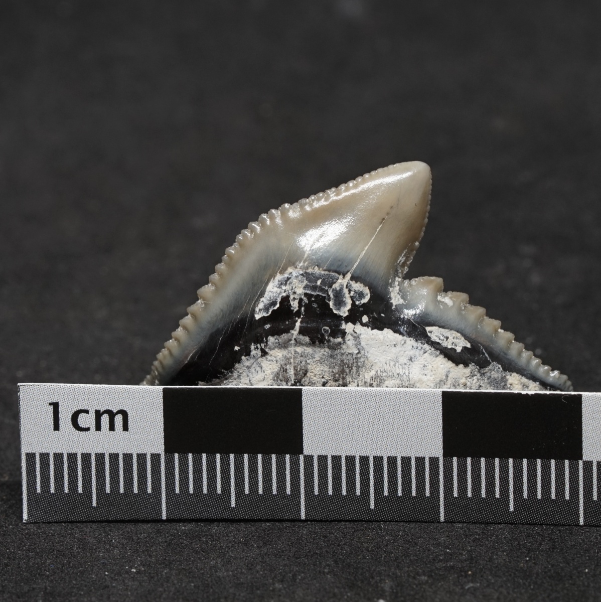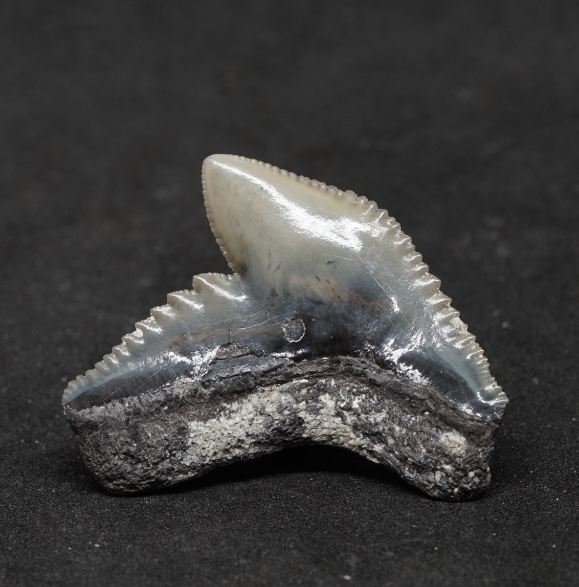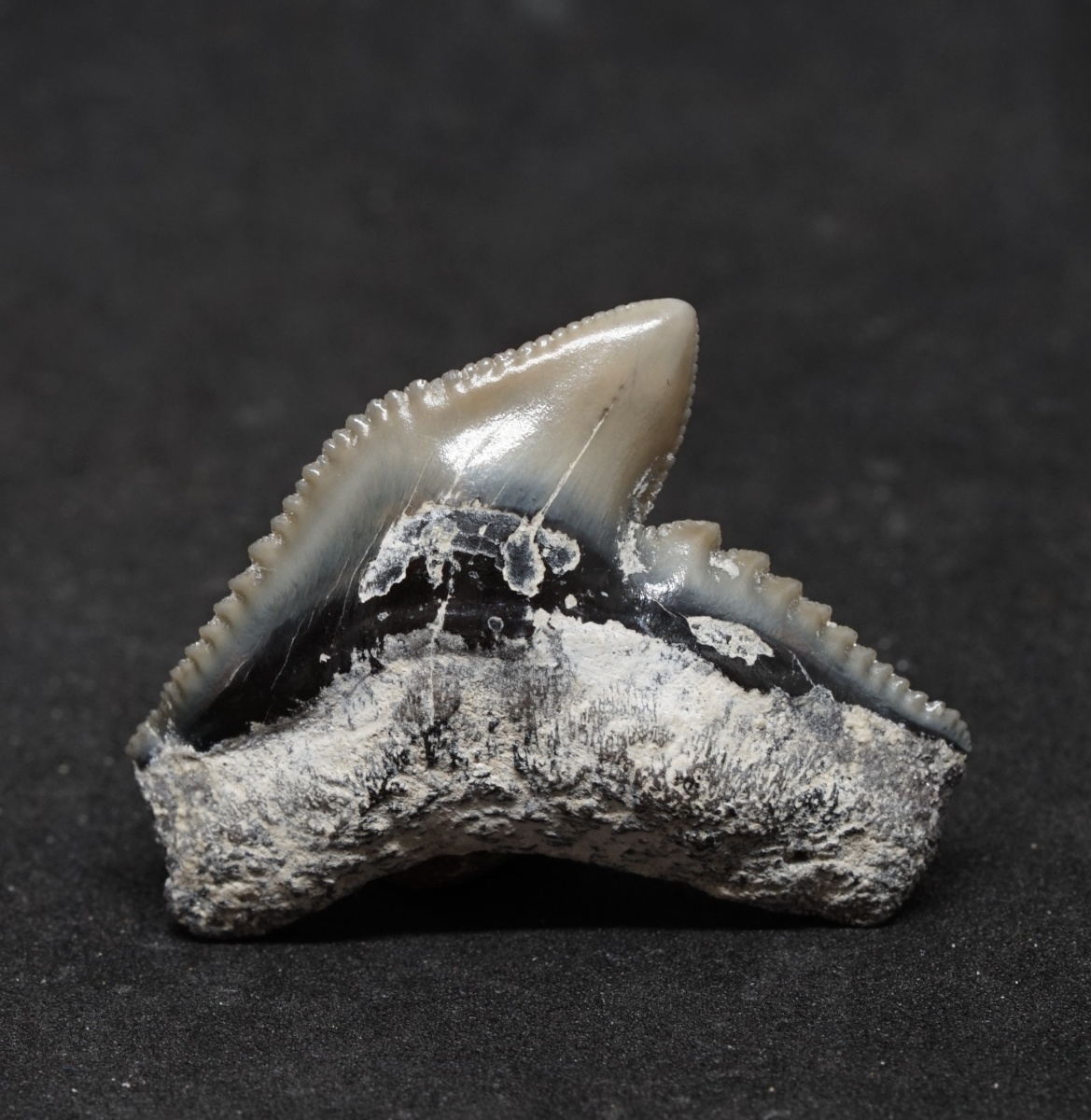Ein fantastischer Zahn eines Tigerhais aus dem Miozän von Florida. Das Stück besticht durch seine Größe und die intensive Farbgebung.