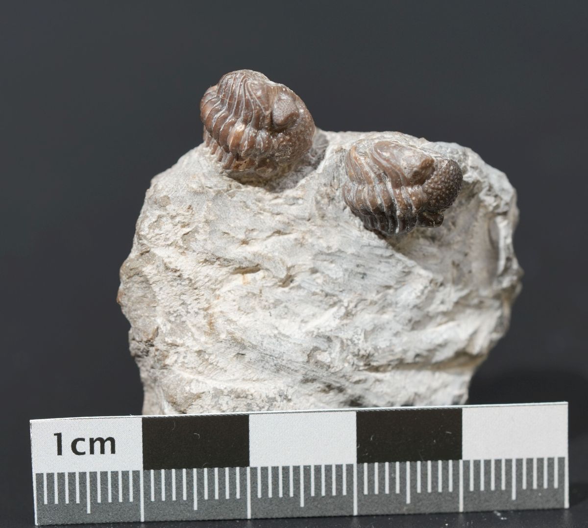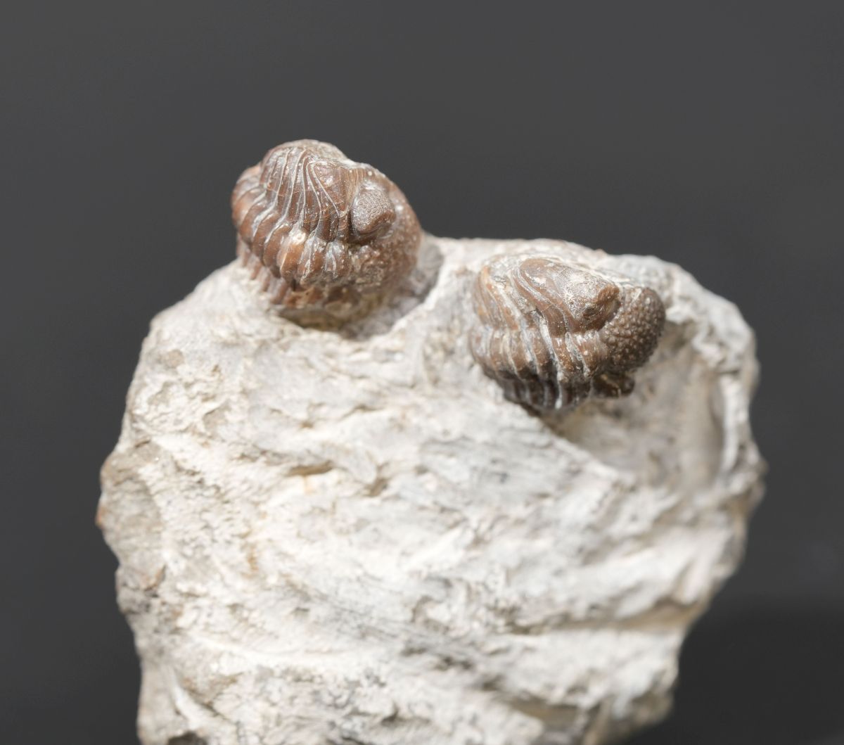 Eine außergewöhnliche Stufe mit drei eingerollten Trilobiten aus dem mittleren Devon der Eifel. Die Fundstelle bei Gees steht schon lange unter Schutz und Funde wie dieser kommen nur selten aus alten Sammlungen auf den Markt.