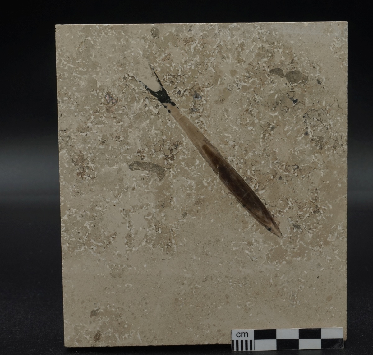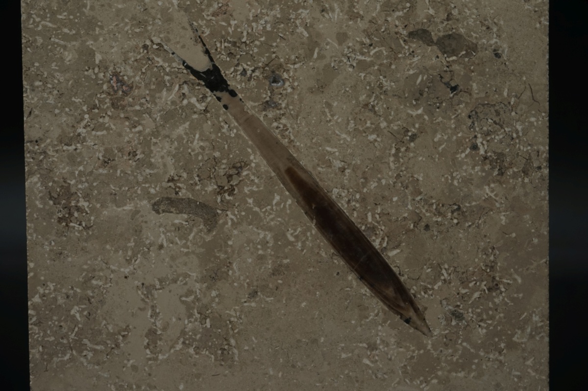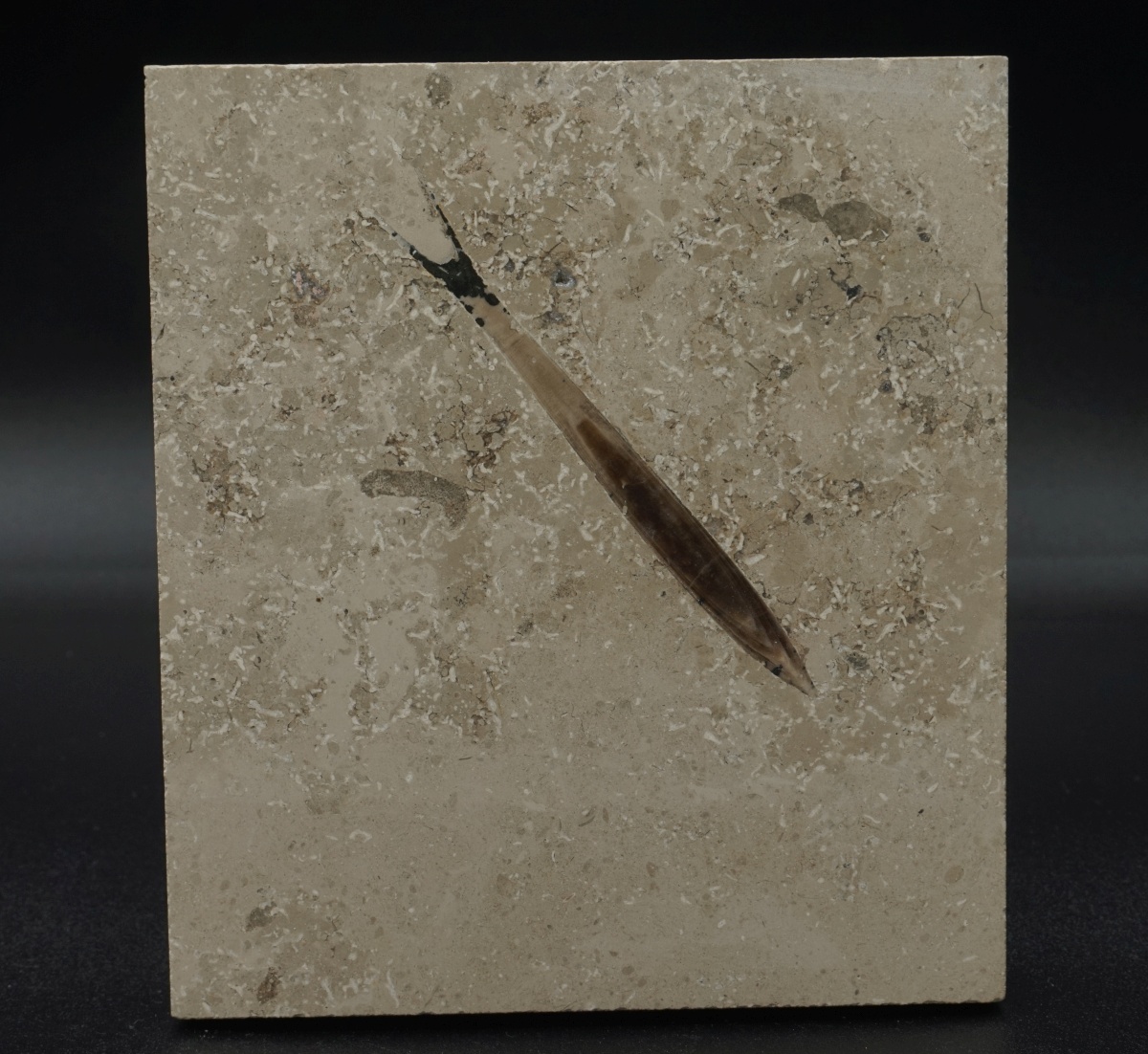 Ein perfekt polierter Anschliff eines Belemniten aus dem "Treuchtlinger Marmor". Bekannt als Bodenbelag in vielen öffentlichen Gebäuden, liefert der Treuchtlinger Marmor gelegentlich auch spannende Sammlerstücke.