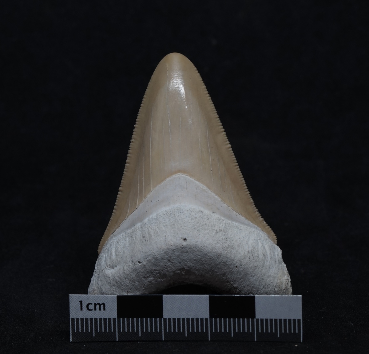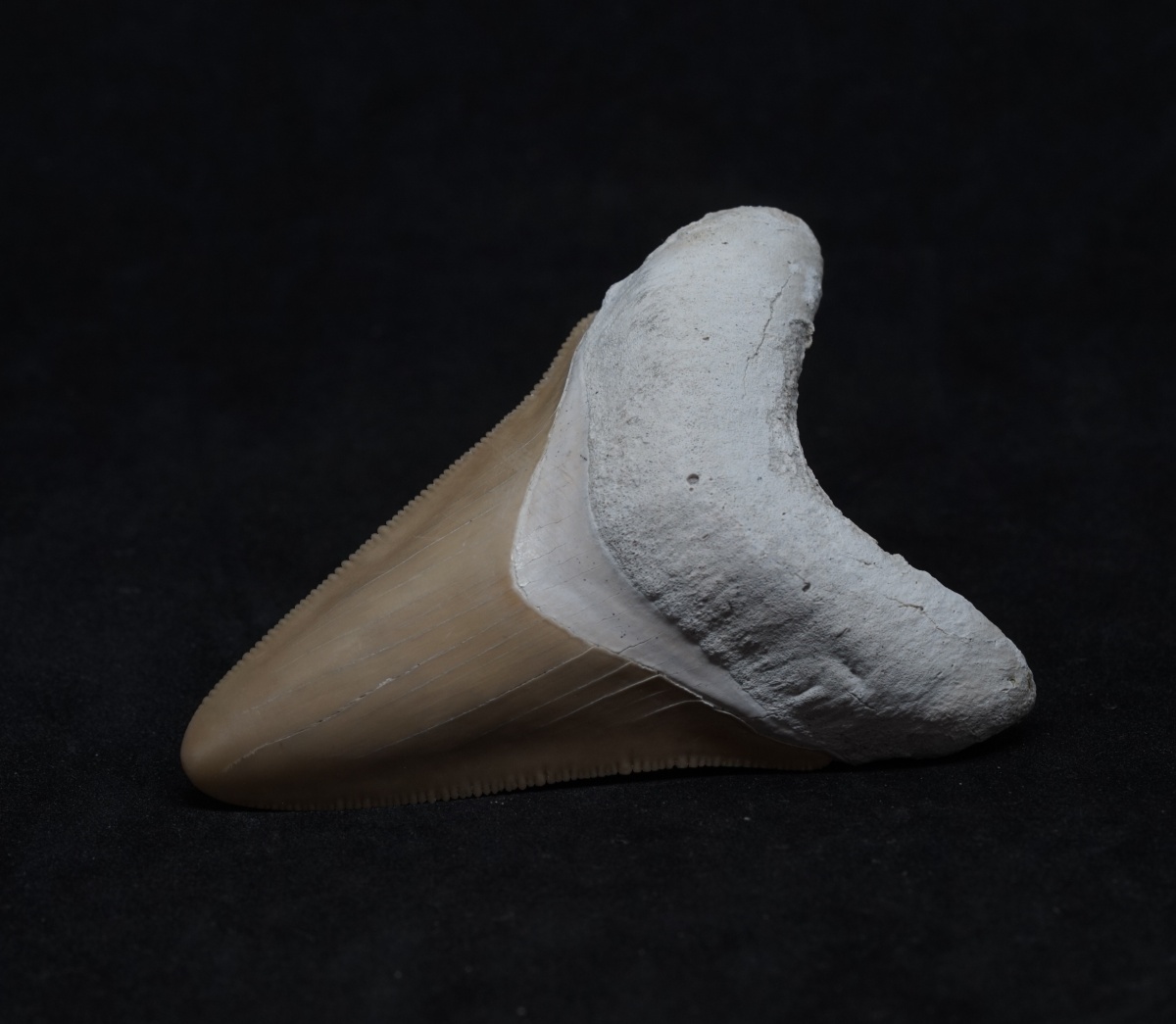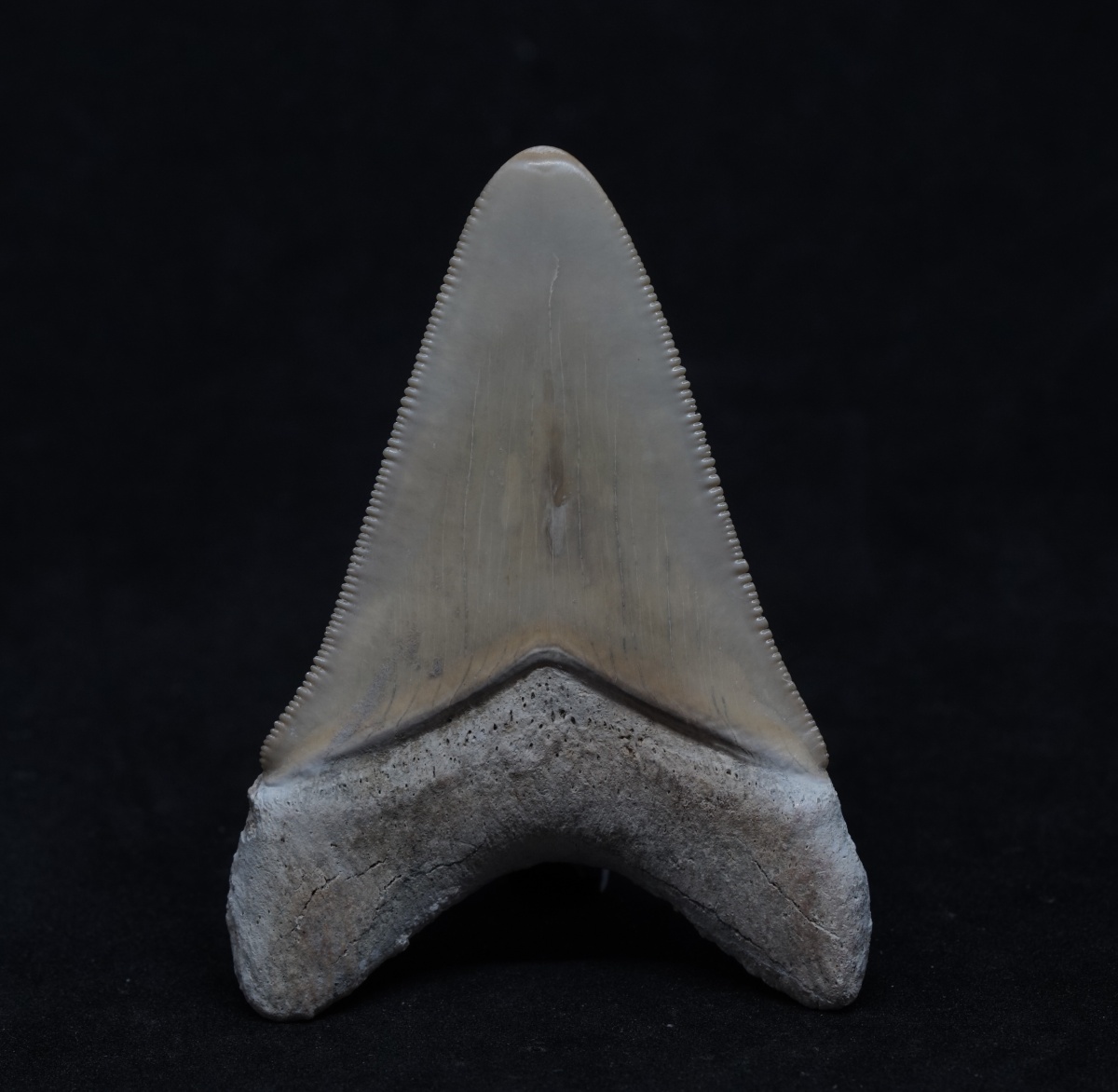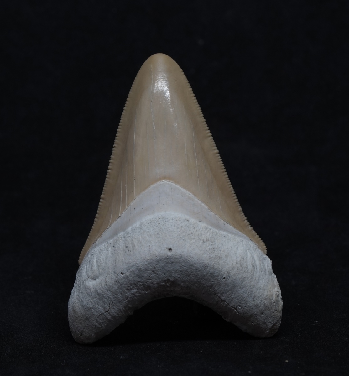 Ein einmalig schöner "Megalodon" (die Art wird inzwischen unter dem wissenschaftlichen Namen Otodus megalodon geführt) aus dem Miozän Floridas. Mit der perfekten Erhaltung und der ungewöhnlich hellen Farbe wird der Zahn zum Blickfang in jeder Sammlung.