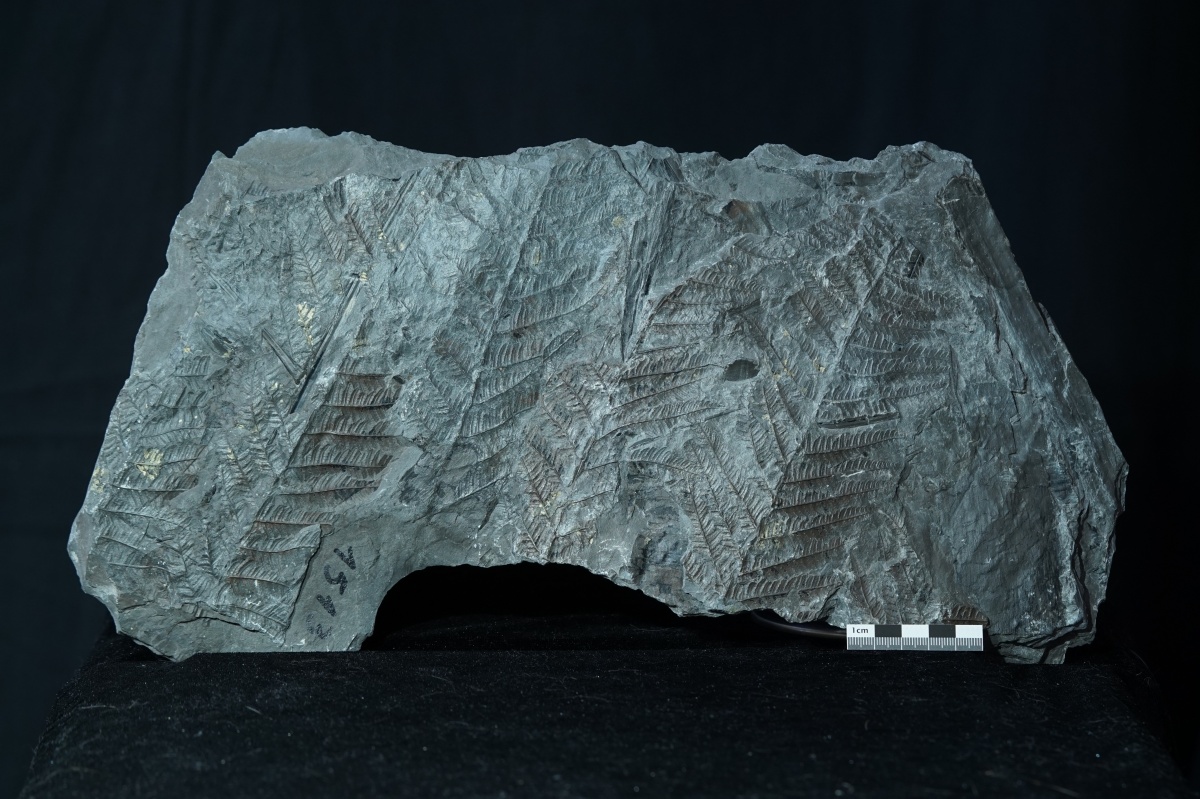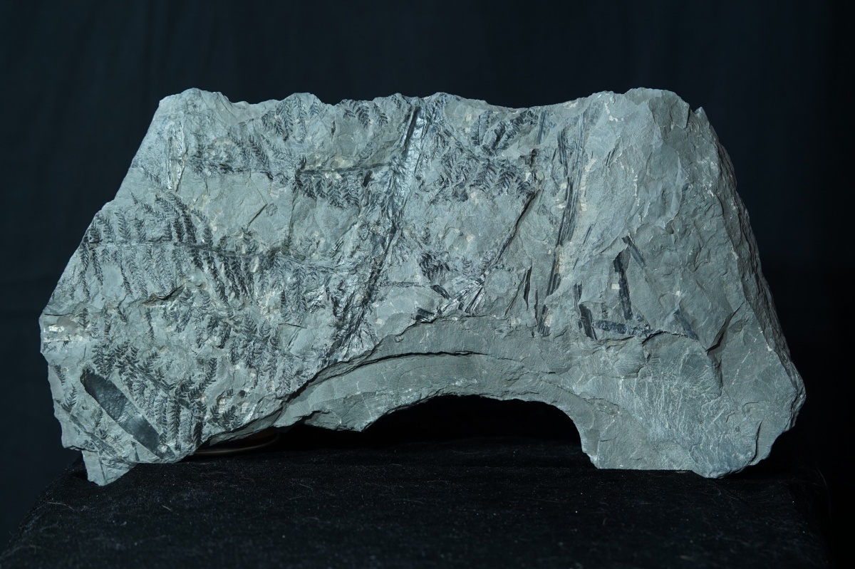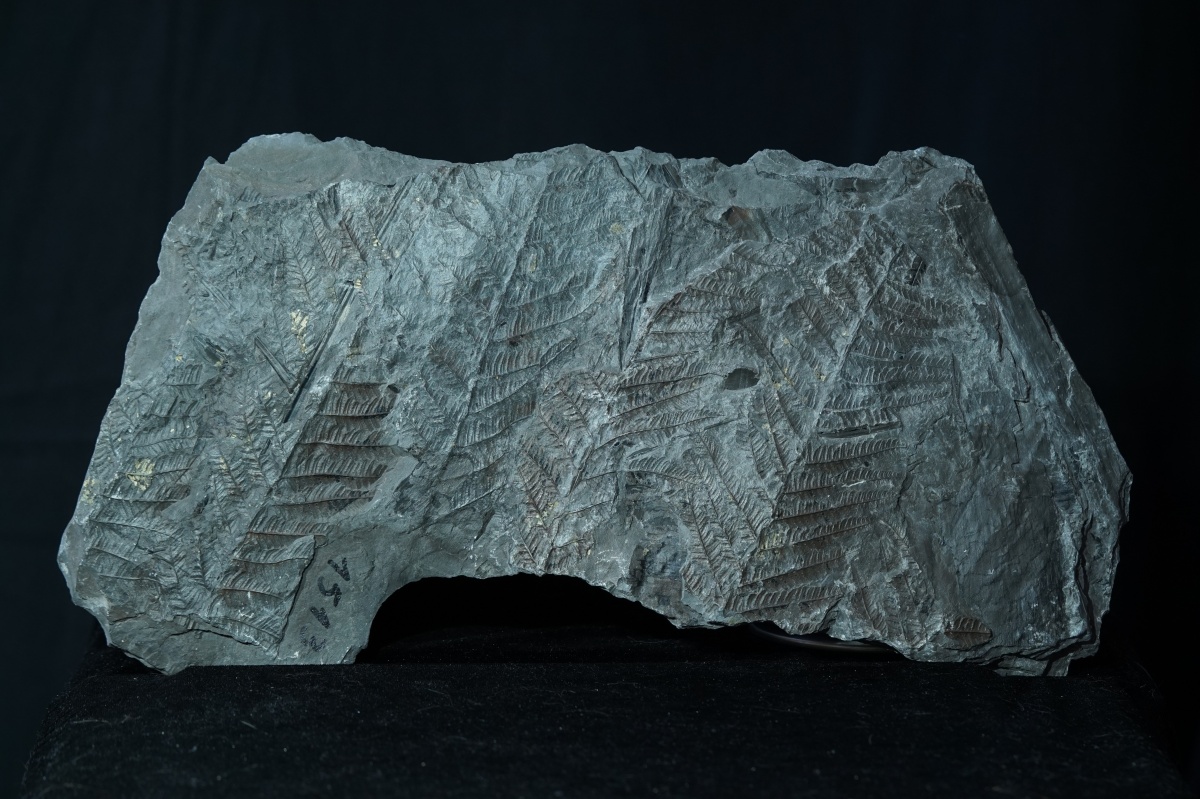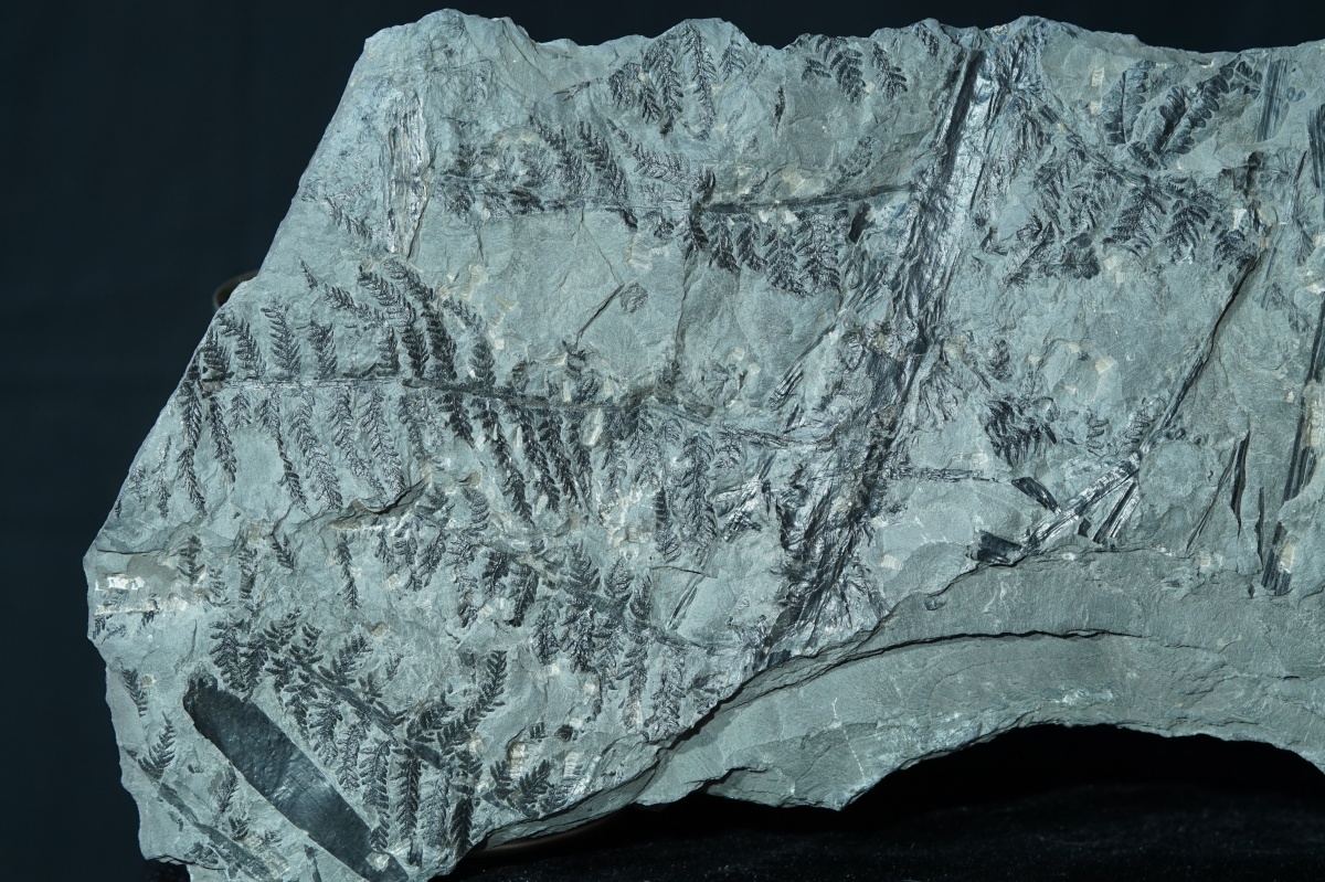 Eine große Platte mit Wedeln des Farns Pecopteris aus dem Oberkarbon des Saarlandes. Das Besondere an diesem Stück: Die Platte hat gleich zwei Schauseiten mit außergewöhnlich schönen Farnen.