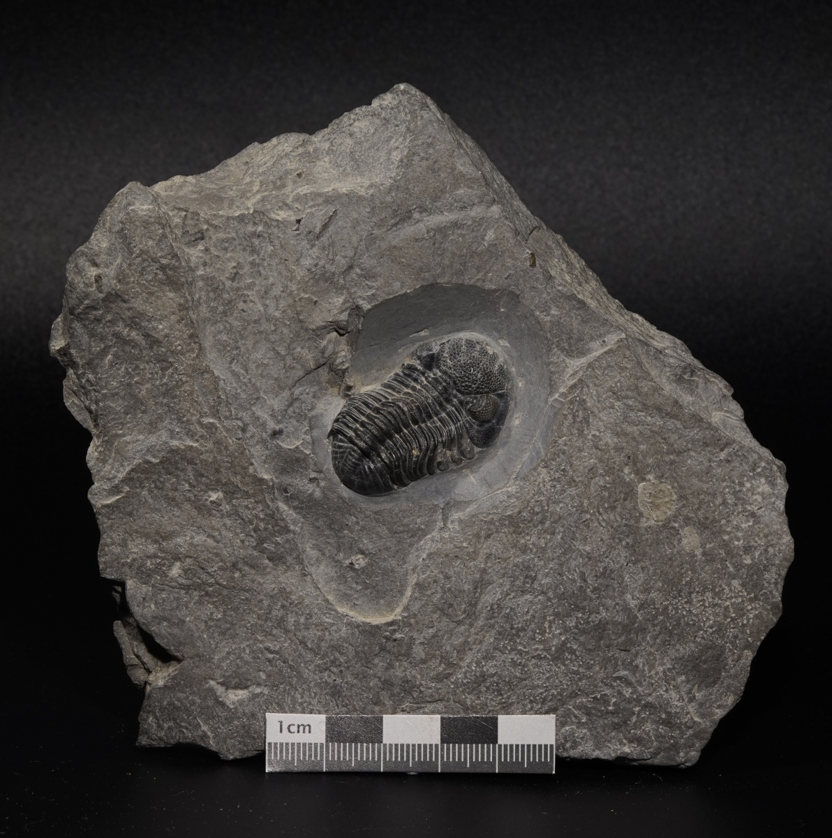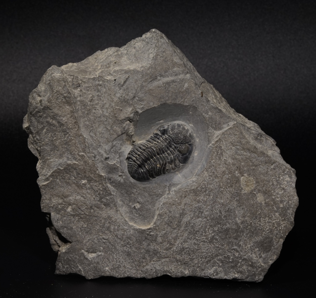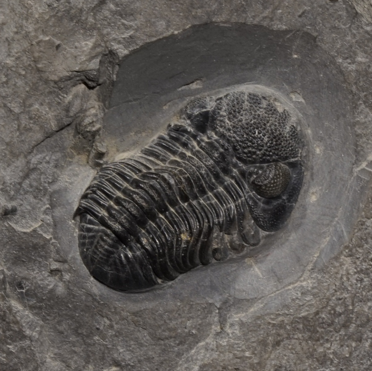 Ein fast perfekt erhaltener Trilobit aus dem Mitteldevon von New York. Die komplexen Facettenaugen sind bis ins feinste Detail freipräpariert.