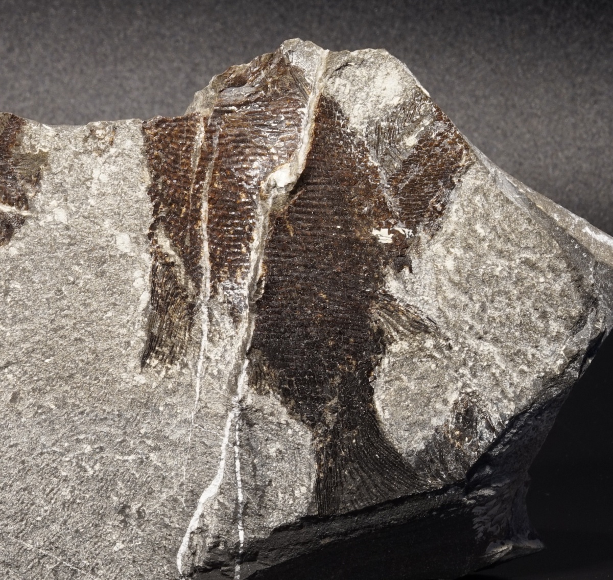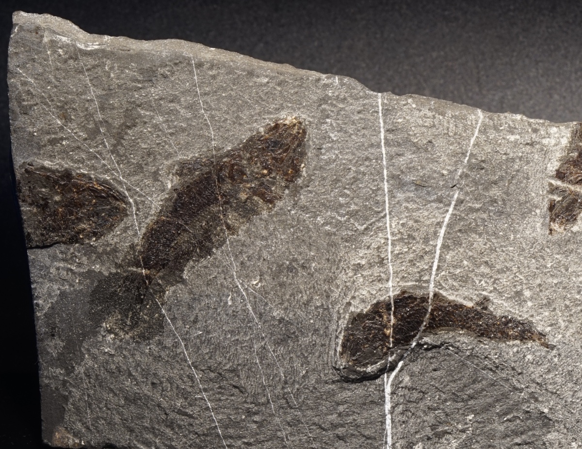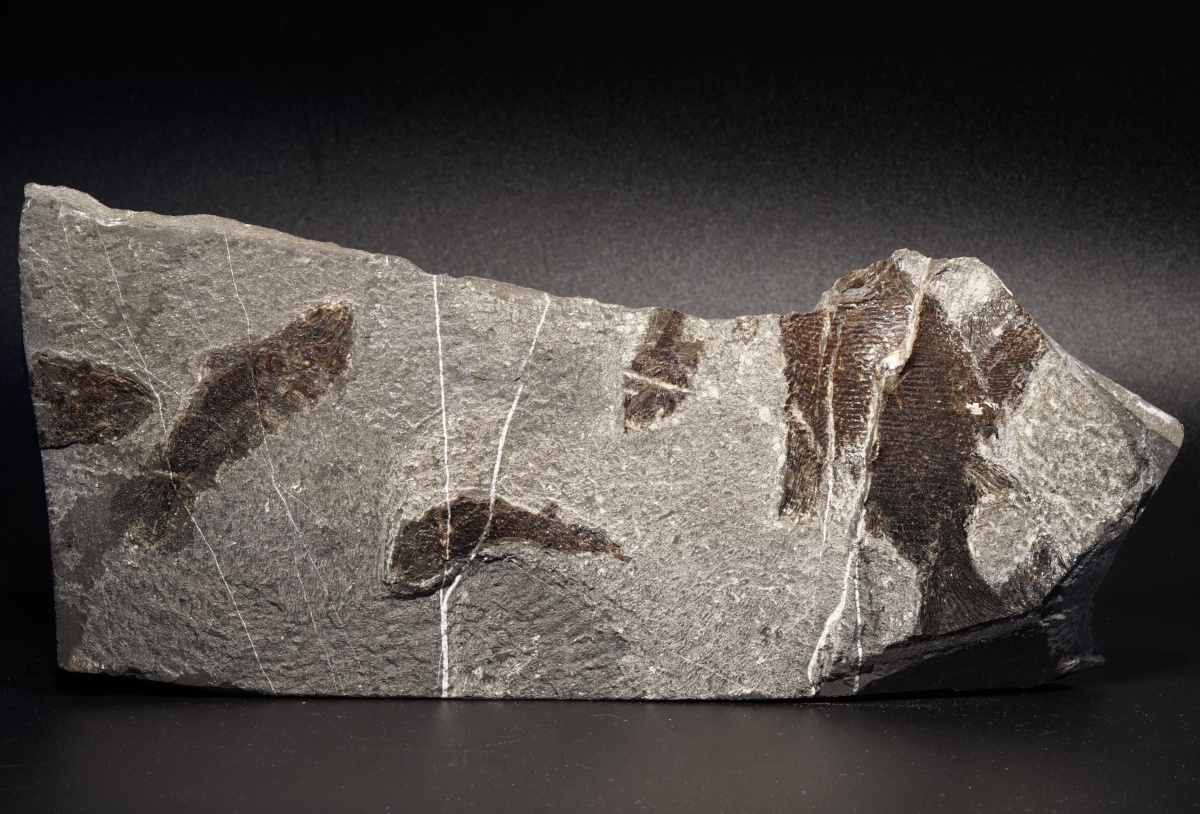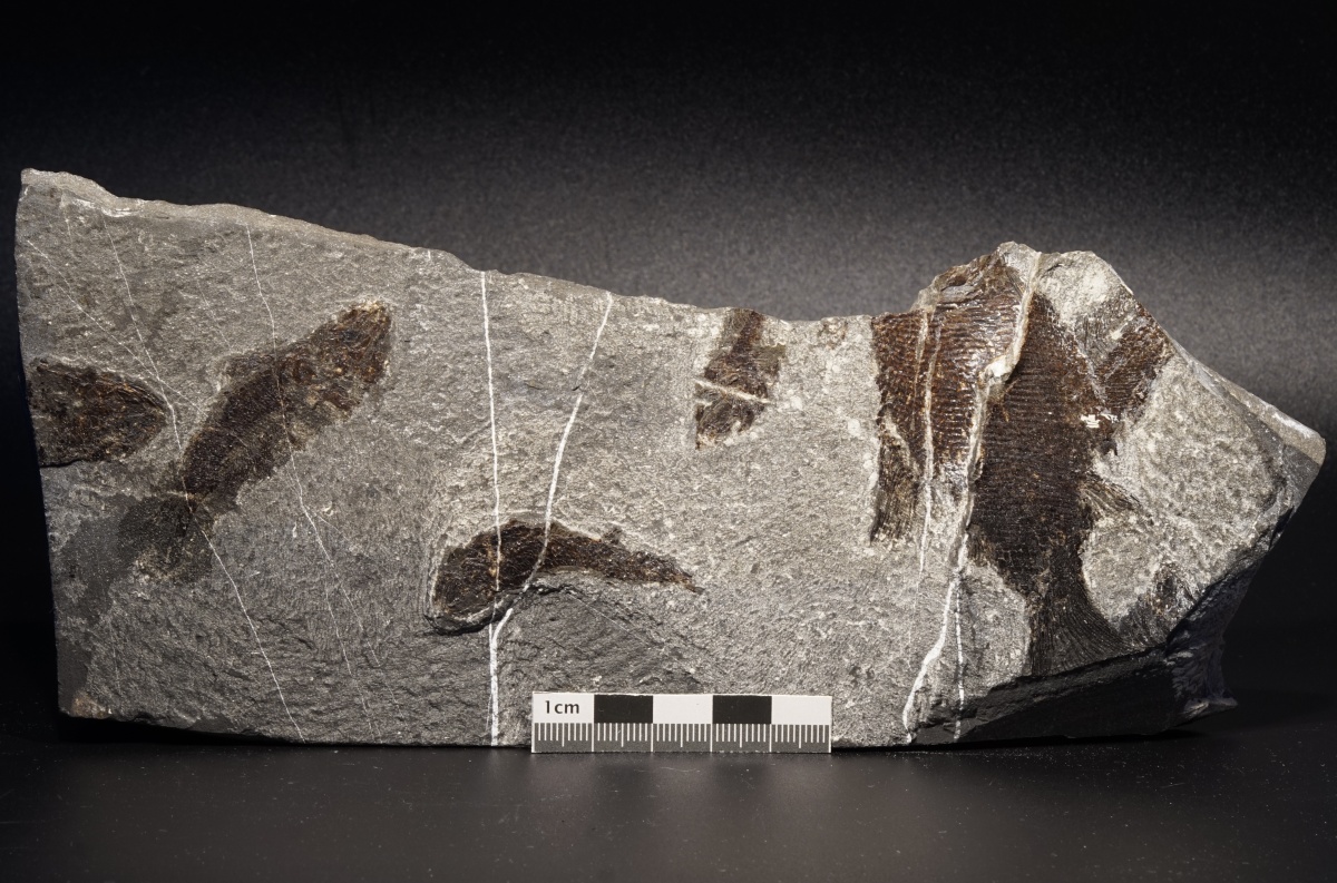 Eine Platte mit mehreren vollständigen und unvollständigen Fischen aus dem Wiestal. Nur eine begrenzte Anzahl von Funden wurden an diesem außergewöhnlichen Fundort geborgen. Auf der Platte sind zwei Arten vertreten: Pholidophorus latisulcus und Legnonotus krambergeri.
