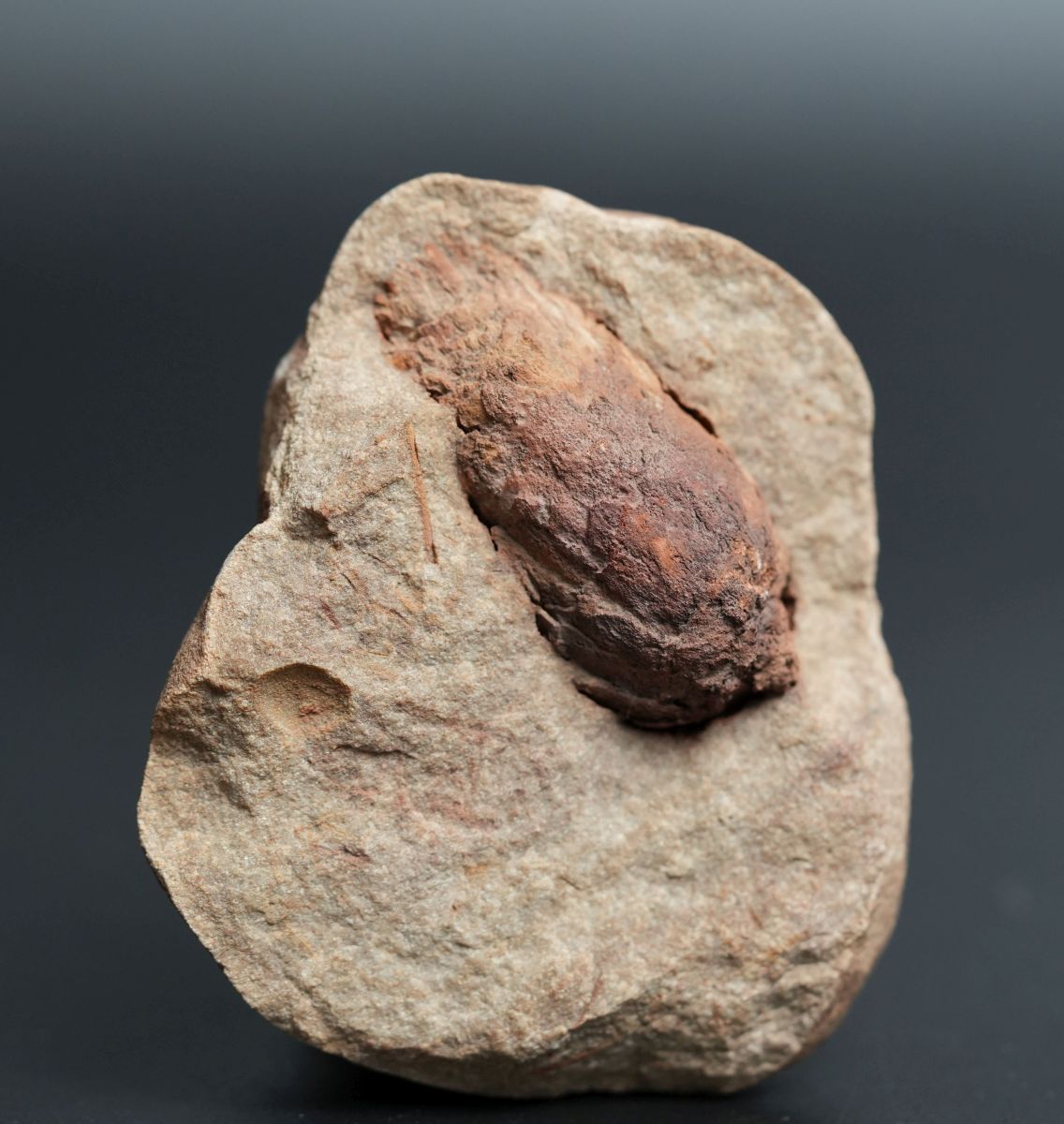 Eine "Steinhardter Erbse" mit einem gut erhaltenen Zapfen. Die "Erbse" besteht aus Baryt, der sich im sandigen Sediment vorzugsweise um einen fossilen Kern, in diesem Fall einen Zapfen, abgeschieden hat.