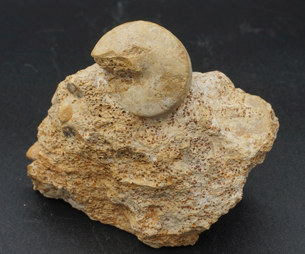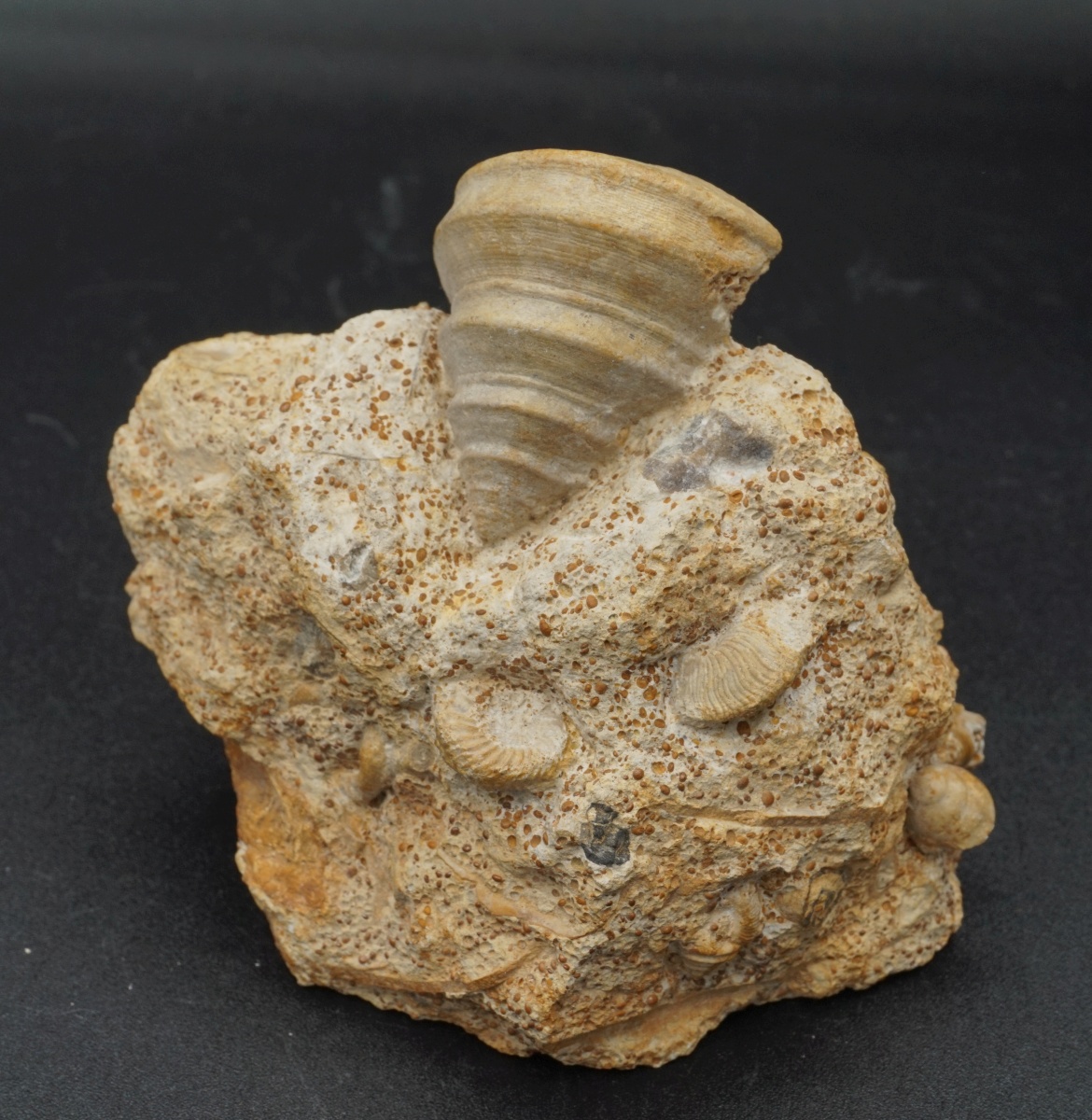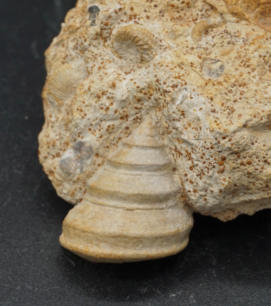 Eine fantastische Stufe mit einer großen Schnecke und reicher Begleitfauna aus der historischen Fundstelle Sainte-Honorine-des-Pertes im Calvados.