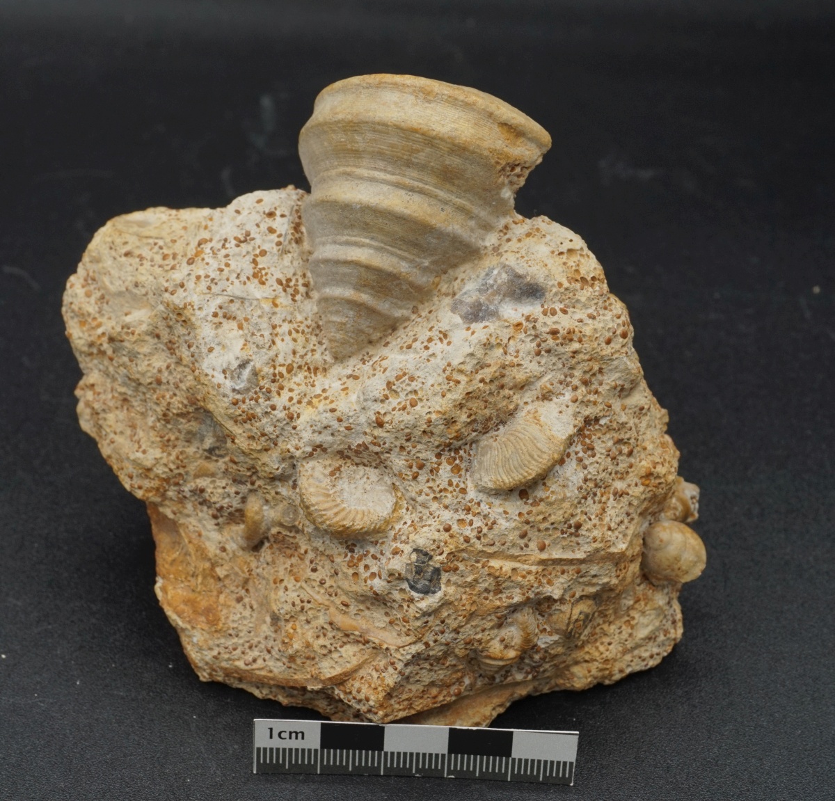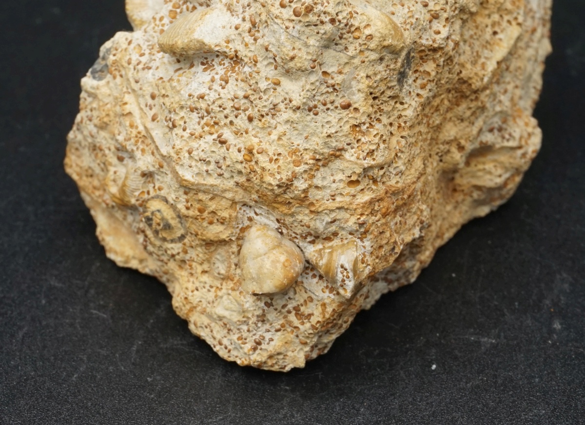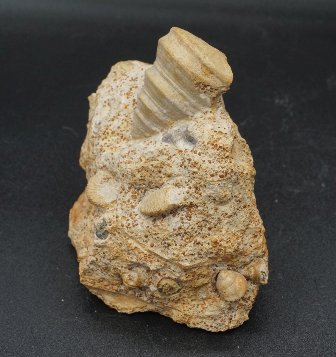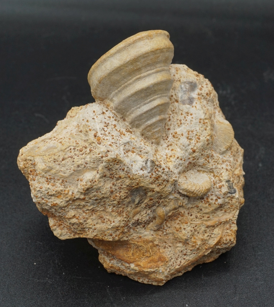 Eine fantastische Stufe mit einer großen Schnecke und reicher Begleitfauna aus der historischen Fundstelle Sainte-Honorine-des-Pertes im Calvados.