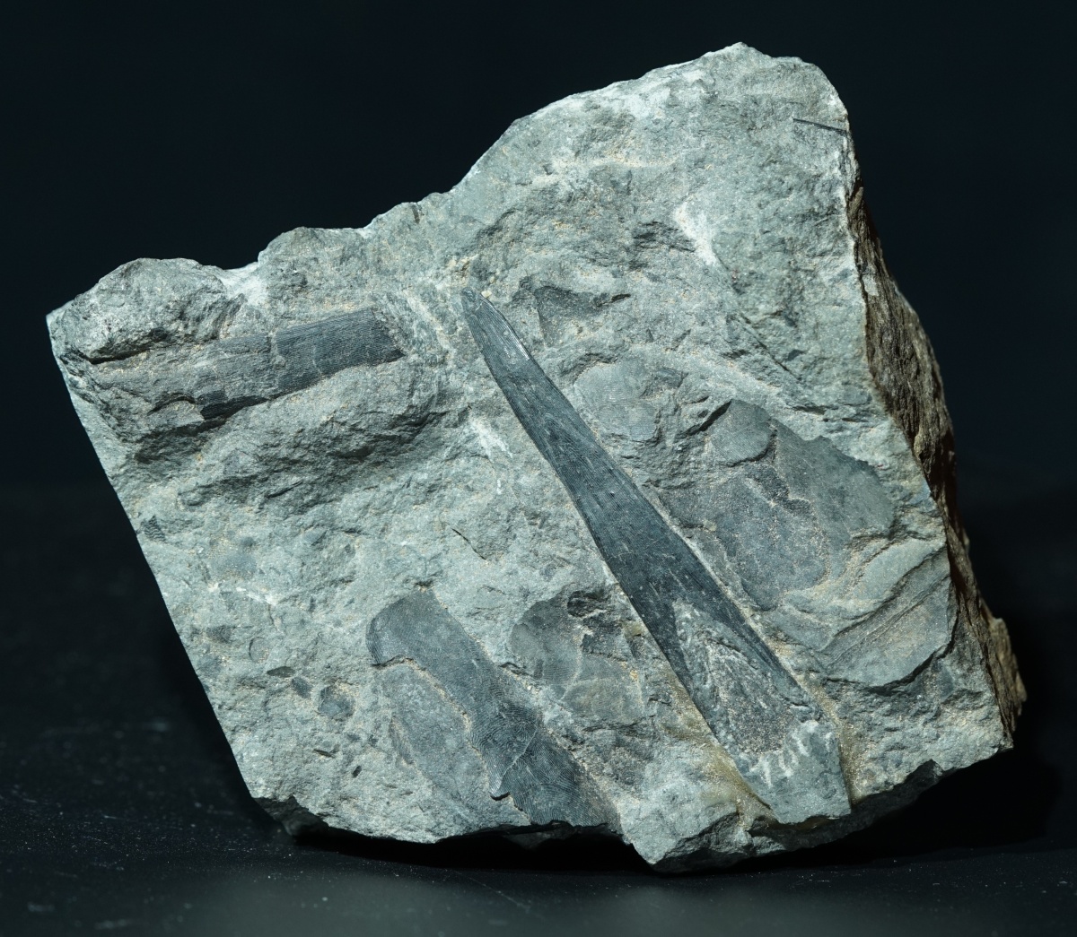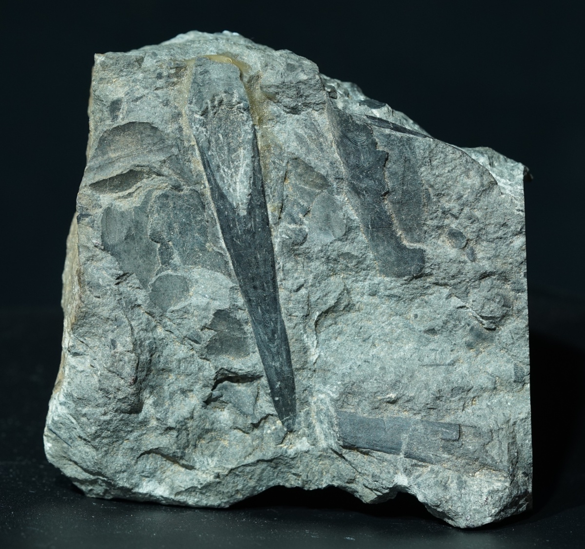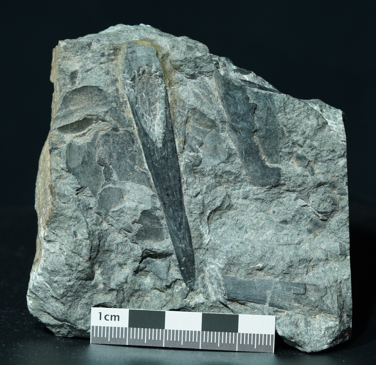 Ein isoliertes Rostrum des Panzerfisches Rhinopteraspis aus dem Unterdevon der berühmten Fundstelle Odenspiel. Neben dem Rostrum befinden sich noch weitere Knochenplatten auf dem Handstück. Das Stück stammt aus einer alten Sammlung.