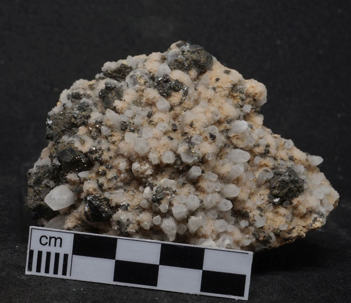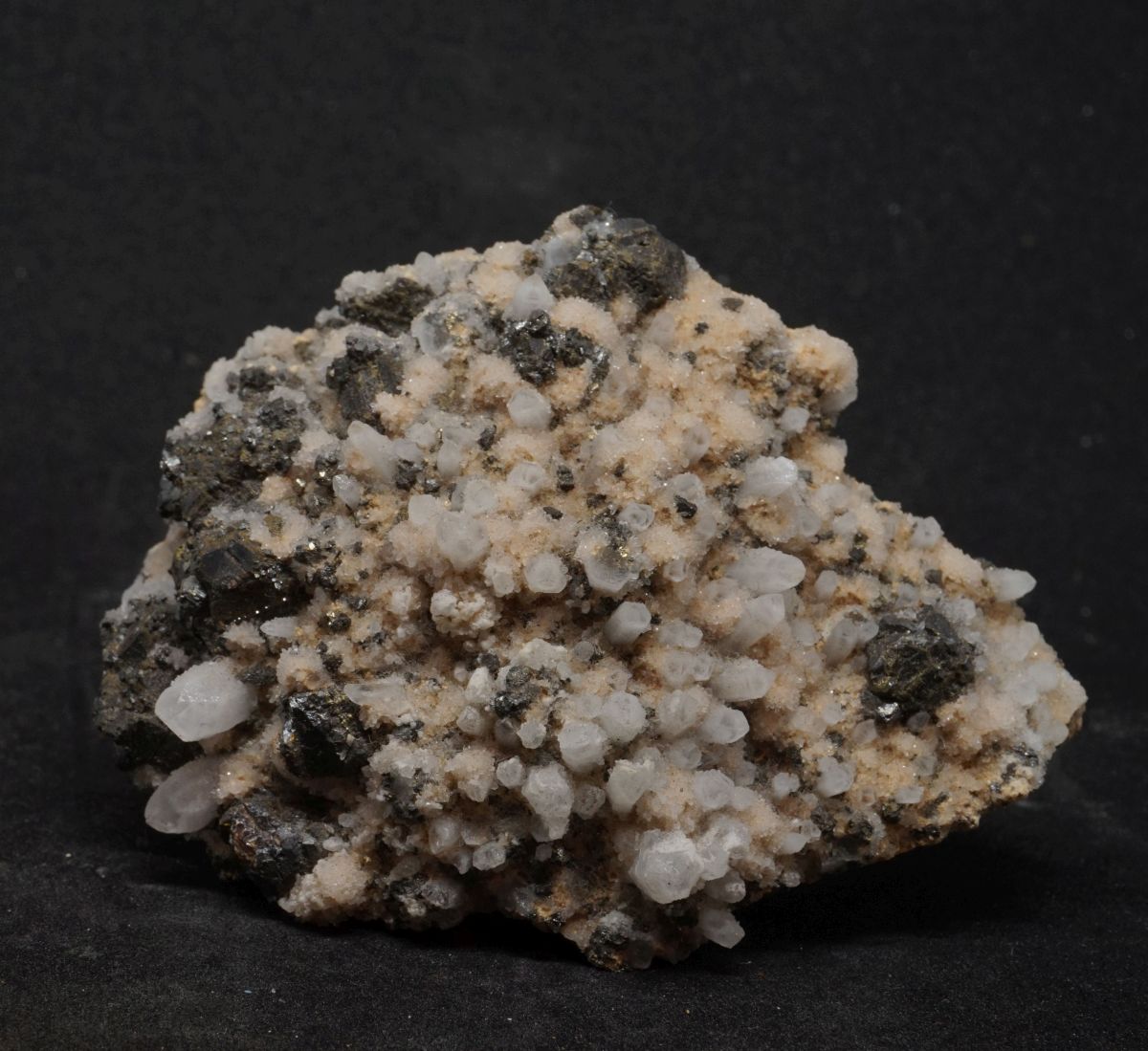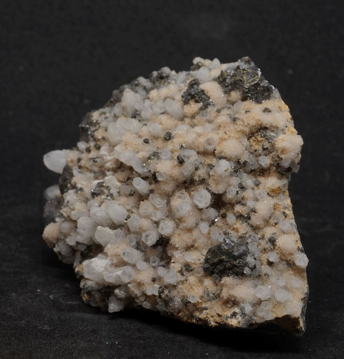 Kleinstufe mit kleinen Aggregaten von Rhodochrosit auf Quarz, mit einigen Sulfidmineralen.