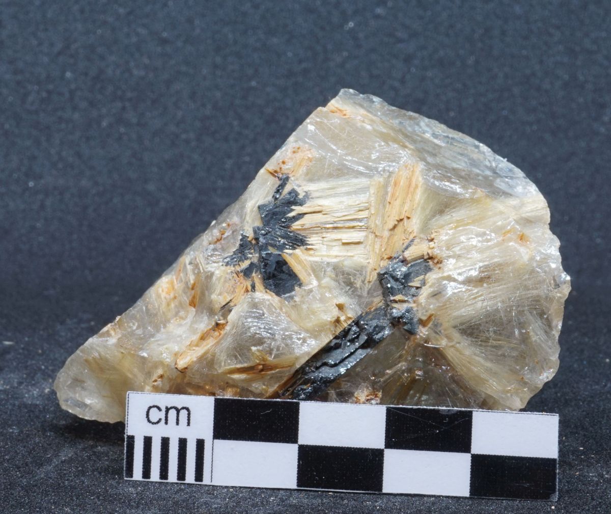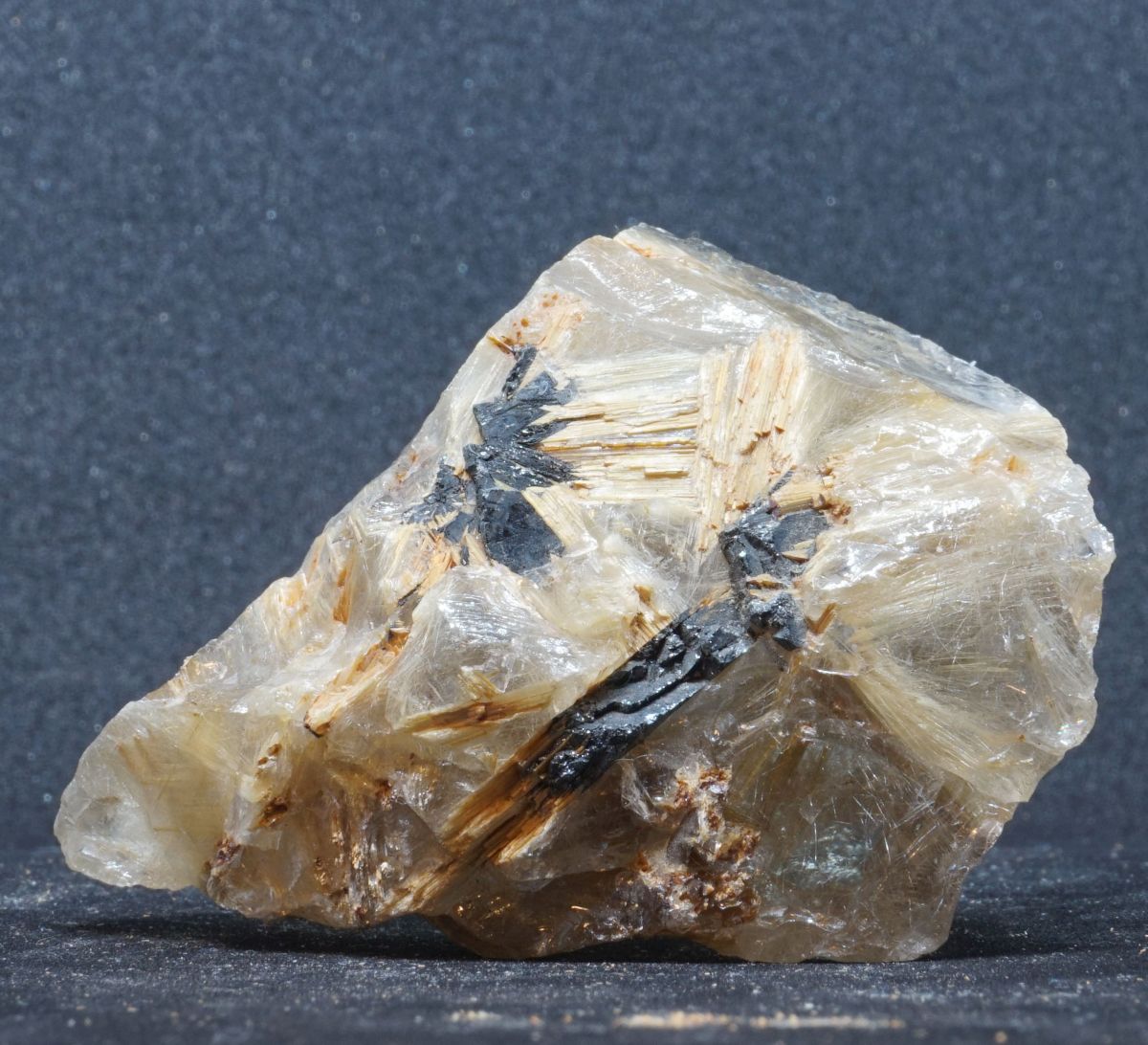 Tolle Kleinstufe aus klassischem Rutilquarz. Auf einer Seite sind zwei sternförmige Aggregate aus Rutilnadeln zu sehen, die epitaktisch auf Hämatit aufgewachsen sind.