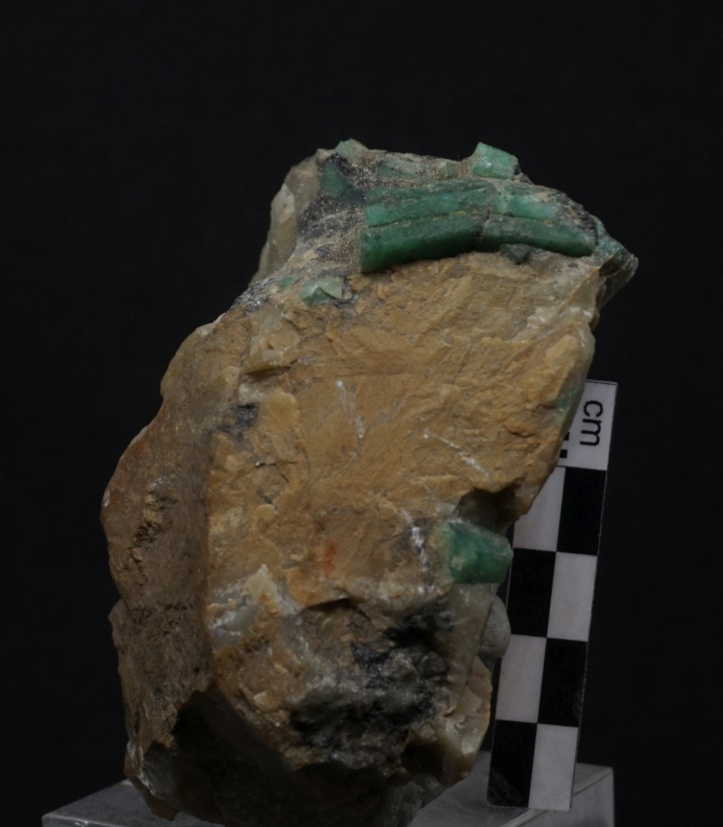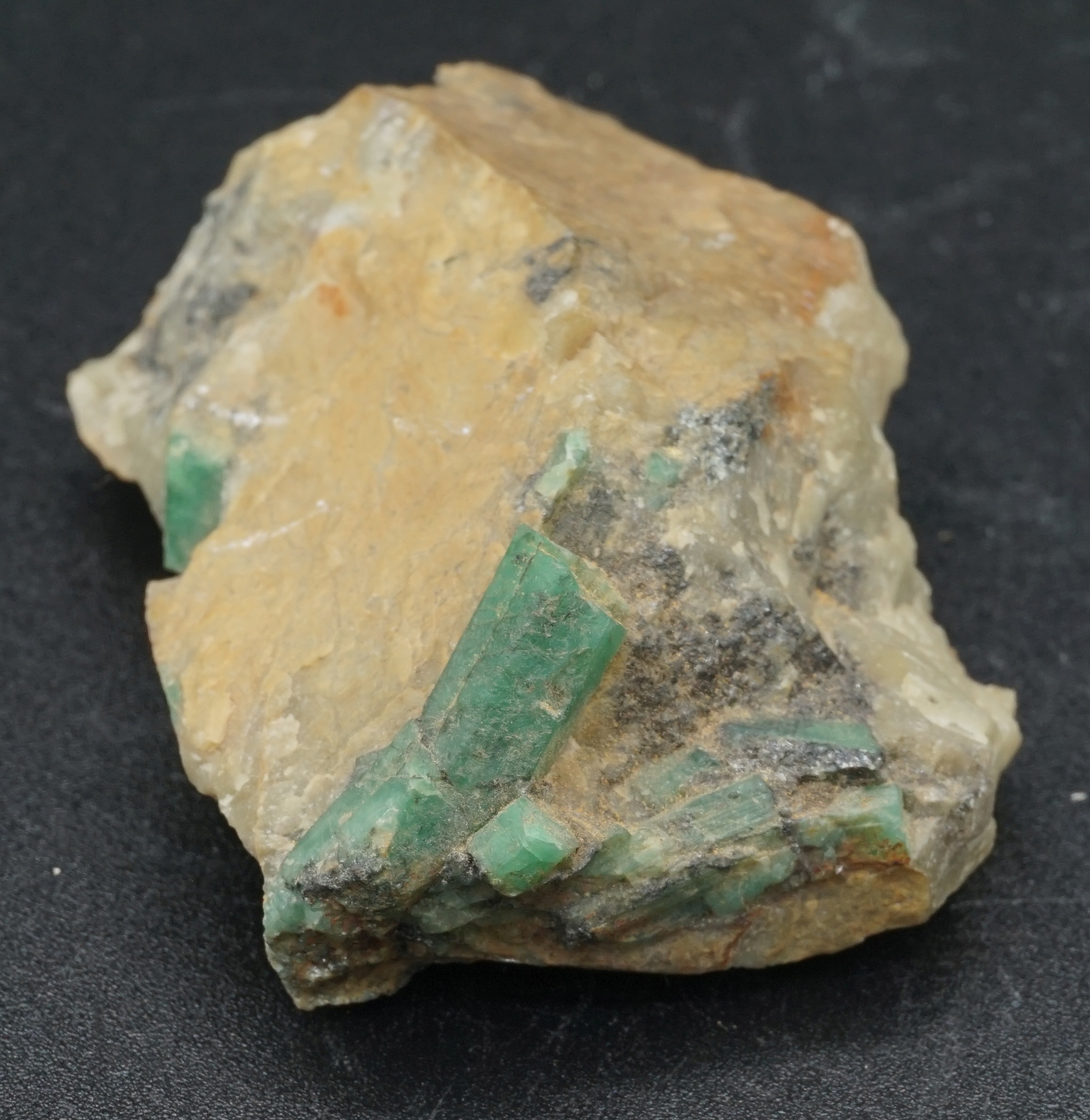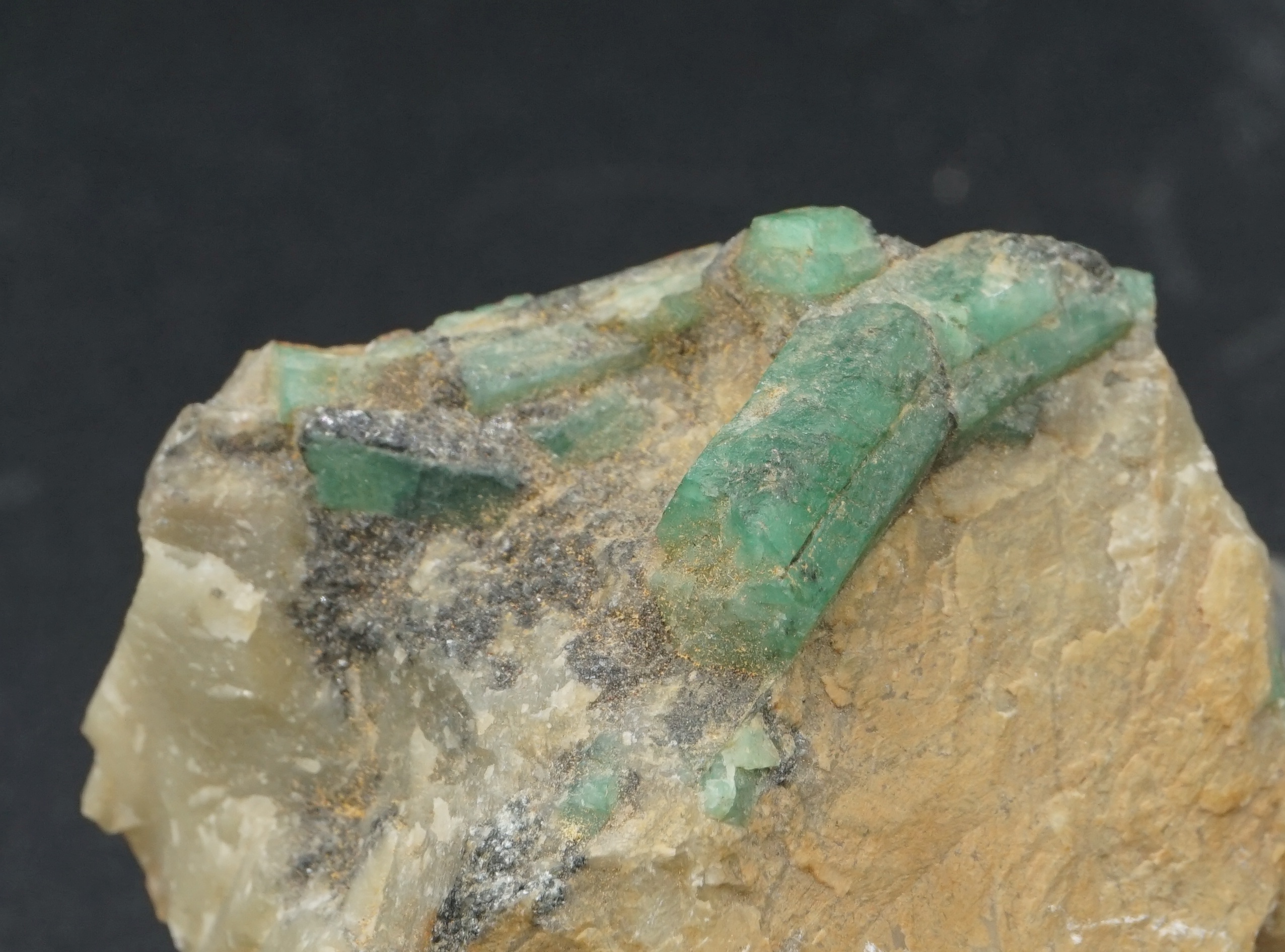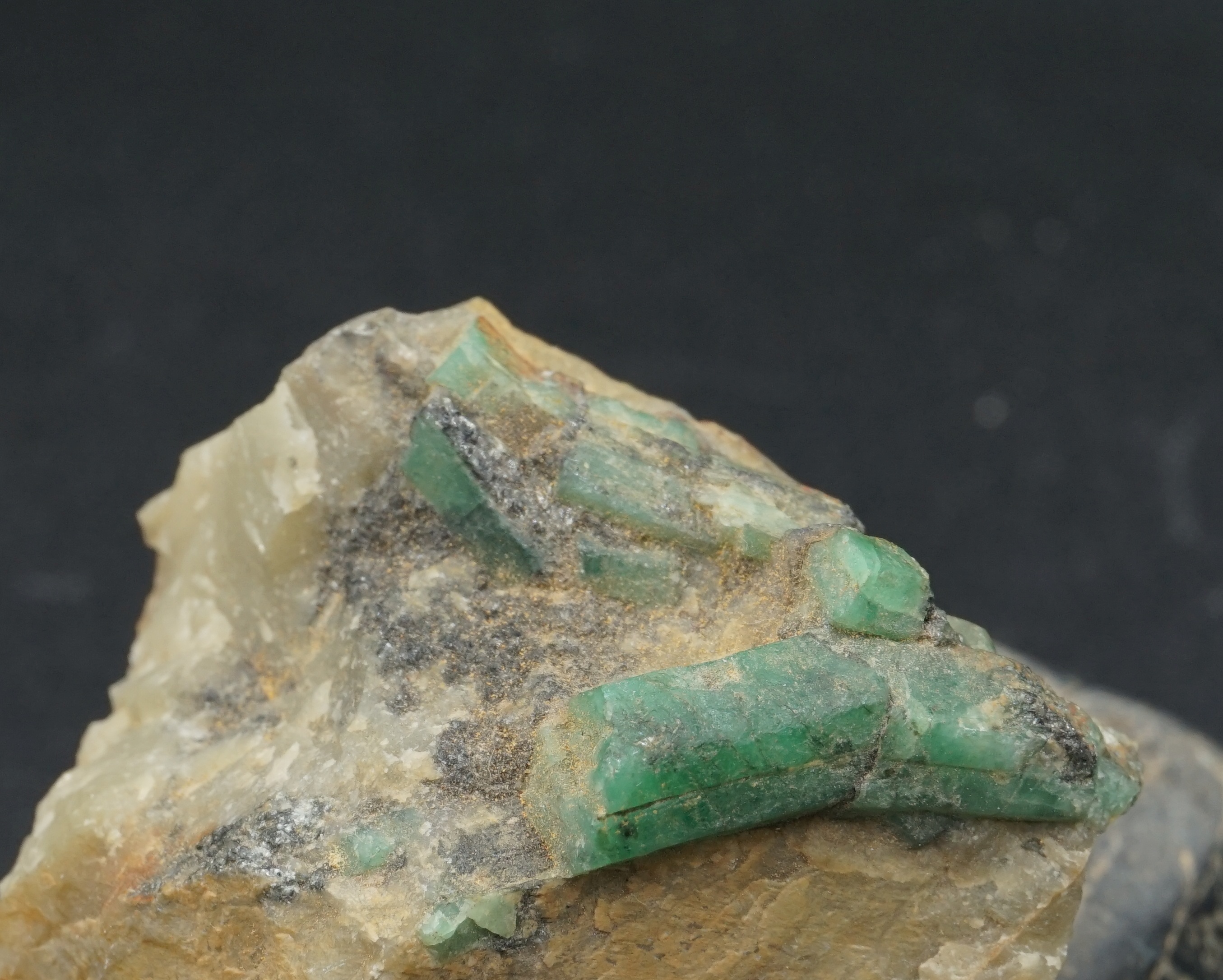 Eine fantastische Stufe mit mehreren großen Smaragden in einer Matrix aus Calcit. Der größte Kristall misst über 8 mm im Durchmesser und ist etwa 26 mm lang. Das Stück stammt aus der legendären Region bei Muzo in Kolumbien.
