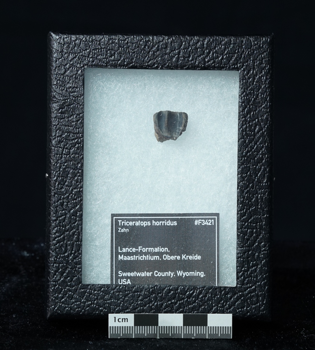 Ein gut erhaltener Zahn des ikonischen Dinosauriers Triceratops aus der Oberkreide von Wyoming. Trotz seiner enormen Körpergröße sind die Zähne von Triceratops überraschend klein, da er eine ganze Zahnbatterie aus hunderten kleinen Einzelzähnen besaß. Durch seine hohe Zahnwechselrate - ein Zahn war nach nur ca. 60-90 Tagen abgenutzt und wurde durch einen neuen ersetzt - findet man einzelne Zähne relativ häufig in den kreidezeitlichen Sedimenten Nordamerikas.