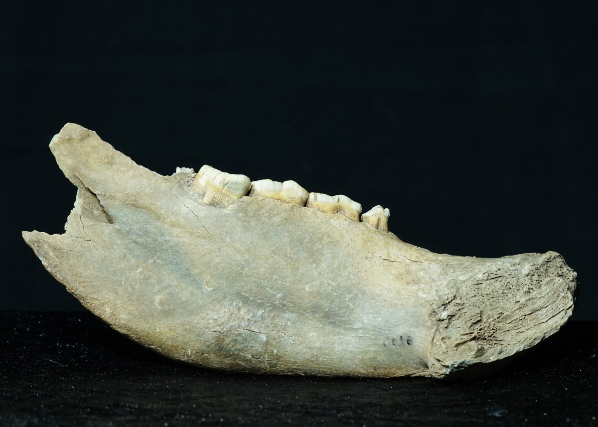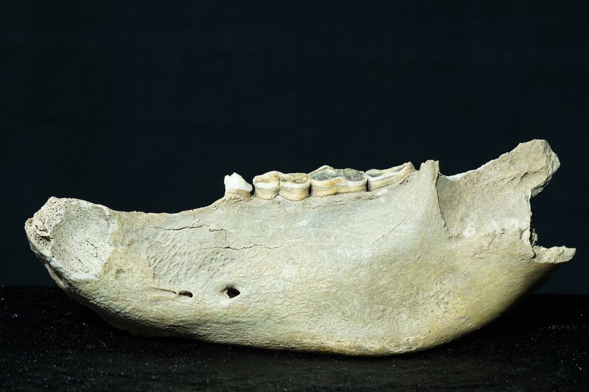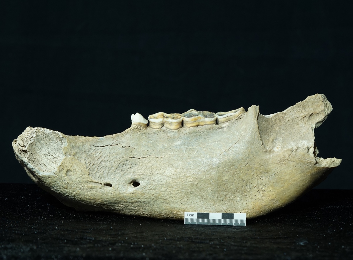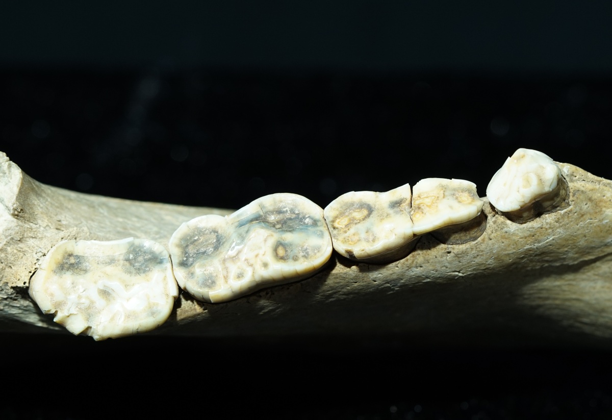 Der Kiefer ist mit den originalen Zähnen erhalten (kein Komposit!), deren starke Abnutzungsspuren darauf hindeuten, dass es sich um ein sehr altes Individuum gehandelt hat.